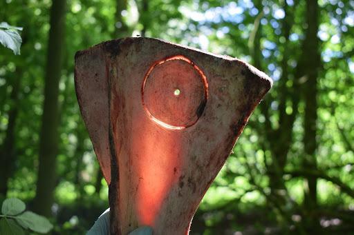 The stencil method produced shallow groove marks which would be joined to scoring from the reverse side of the scapula. Of note were the natural features of the scapula which made using a stencil uneven and the rondelles produced of different thicknesses. The spine of the scapula made carving particularly difficult and resulted in a visible ridge on one of the rondelles. To compensate, the researchers grooved from both sides of the scapula at various points, sometimes made easier by holding the bone to the light (See Figure 6). Again, the size of the rondelle was mechanically limited, in this case by the size of the stone used as a template, a limitation that was carried over to the bone rondelle blanks that were subsequently used as templates. Given the wide range of sizes encountered archaeologically, it is again unlikely that a stencil was routinely used. Indeed, a template could be feasibly cut freehand and then used directly as a template for the next rondelle blank if a similarity in size was important for some particular purpose, without the need for a stone. While the use of a stone cannot be ruled out, the lack of recovered stones with edge damage from contact by a moving flint tool, along with the mechanical limitations offered by the use of a stone, or the need for several stones of varying sizes to compensate, perhaps suggest that a freehand method is the more likely, in particular as there was only modest differences in the degree of roundness achieved.