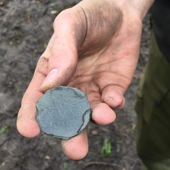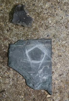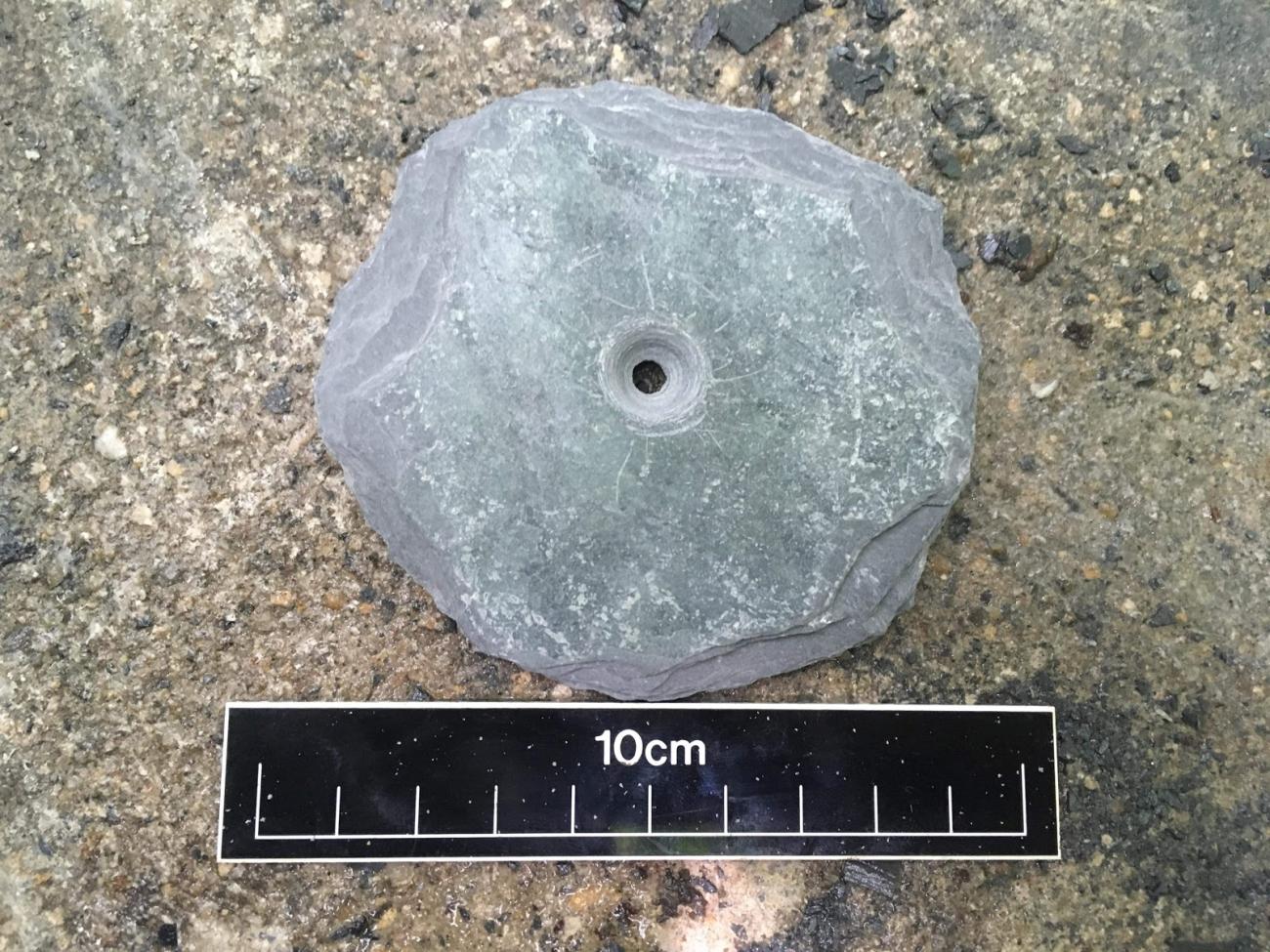 The production of slate rondelles utilised an inverse method as compared to the bone. Bone scapulae were grooved to form the outline of the blank and then indirect percussion and further grooving used to release the blank. In the case of slate, the outline was engraved into the stone using flint in a similar fashion (in this case, using a freehand method) but the surrounding superfluous slate was knapped and struck off using small hammerstones (See Figures 8a-c slate) to reveal the final form. This was because the slate was far more brittle than bone, requiring a different strategy to release the blank.