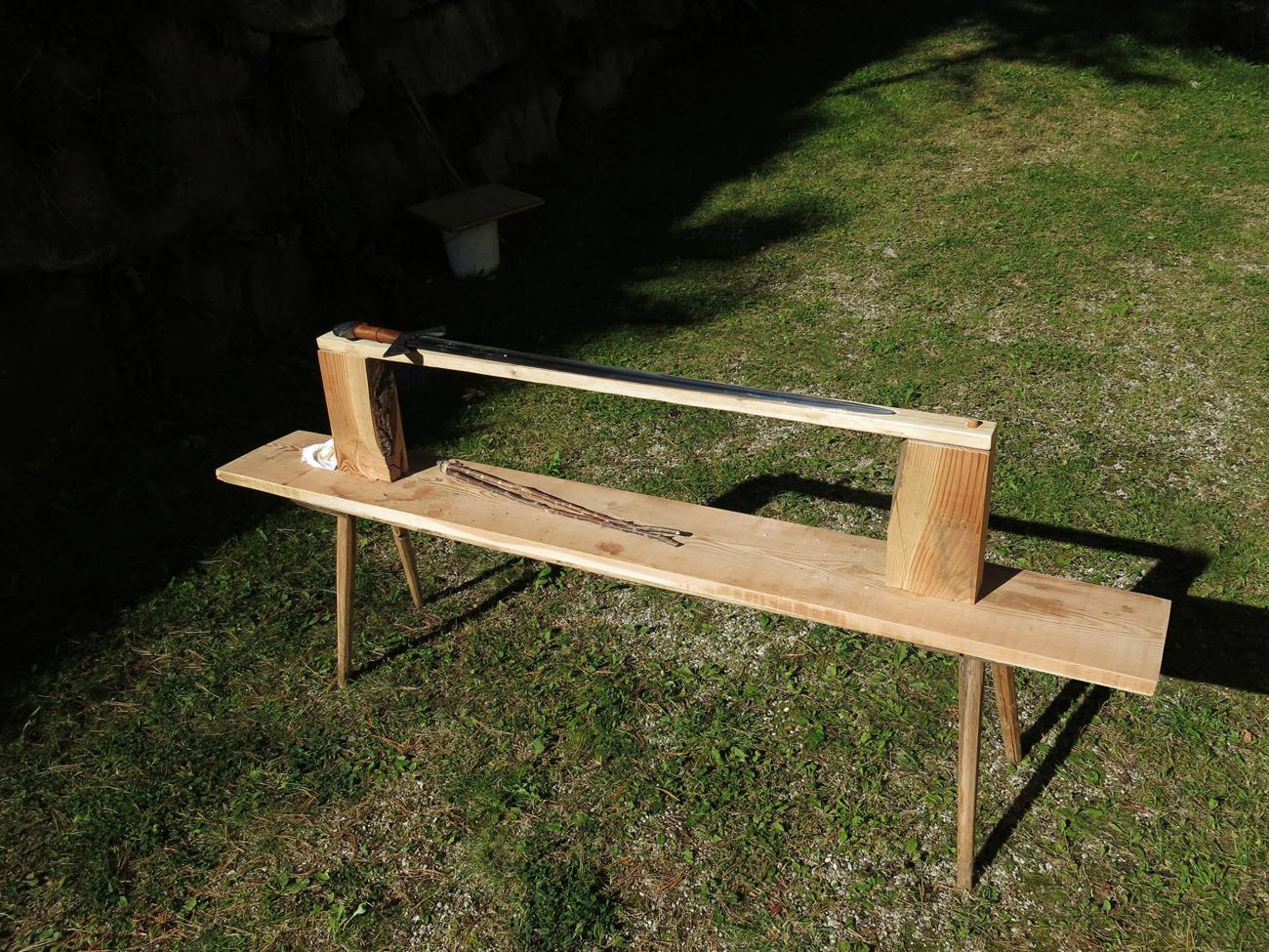 Due to the detailed image sources, the reconstruction of the polishing bench was not a major problem: Two massive uprights (28 x 20 x 5 cm) were mortised into a board with four legs, 180 cm long and 24 cm wide, and fitted with dowels. A 128 cm long and 5 cm wide board was then applied on these. The dimensions of the latter board depend on the length of the swords to be polished: one-handed swords of the High Middle Ages usually have a length of about 100-110 cm, but late medieval one-and-a-half-handed swords can be up to 125 cm long, or even longer.