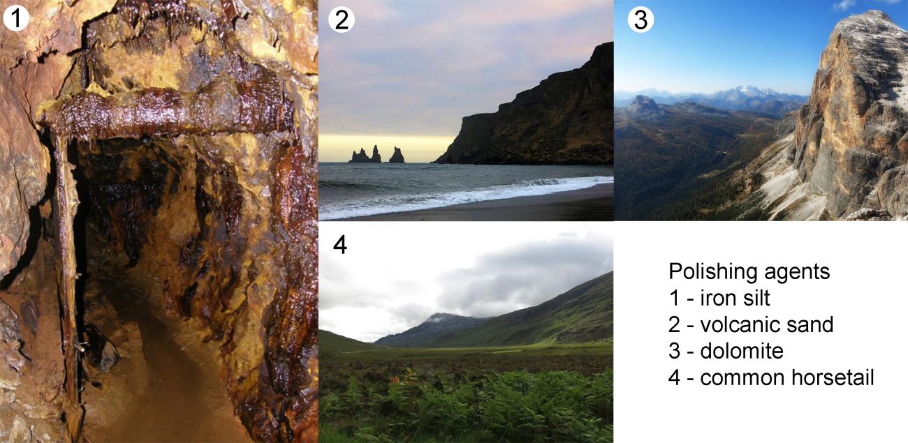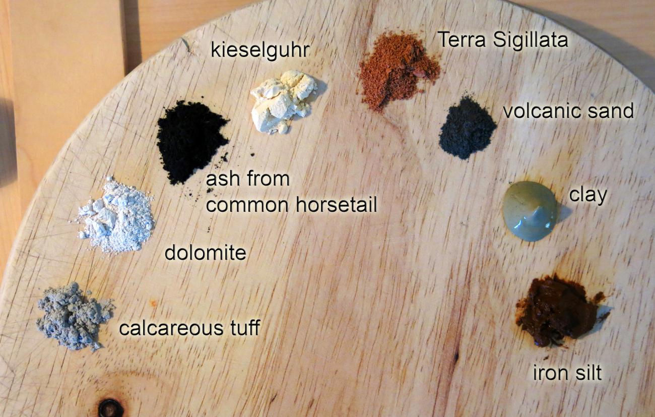 A brief note here on grain size: All polishing agents passed through the same grinding procedure, but some of the samples could be ground much better and finer. The designations from coarse to fine refer to the relationships between the substances themselves. Even the relatively coarse volcanic sand has the consistency of fine flour.
