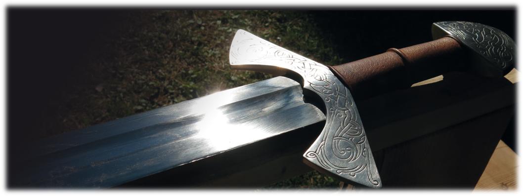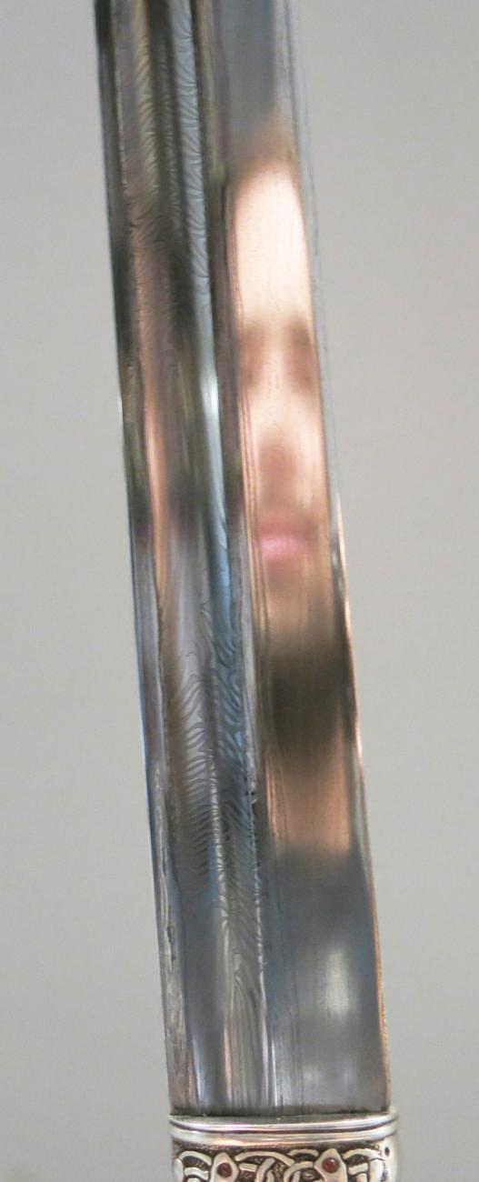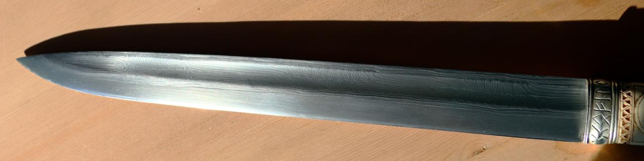 It is a "Langer Schmalsax" (length of the blade 35 cm, width 3.5 cm), with elaborate decoration in animal style from Scandinavia, made by Jeff Helmes from Canada (See Figure 14). The swordsmith refined the metal for the blade himself, so that it comes close to an original. Characteristic are the clearly visible foldings of the iron in the area near the cutting edge. With this process of the repeated folding the iron was cleaned from slag and other impurities. The heart of the blade is the characteristic pattern welding in the area of the fuller, which consists of two twisted steel rods with different carbon contents.
