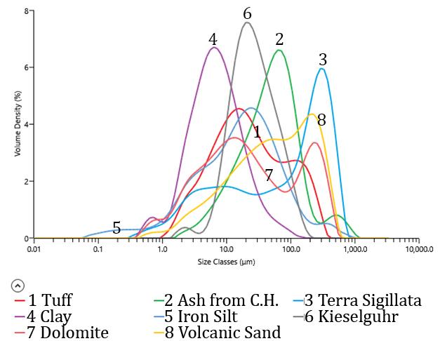 Thanks to Jasper Moernaut of the Institute of Geology at the University of Innsbruck it was possible to analyse the grain size of the agents. For the research a Malven Mastersizer 3000, a laser diffraction particle size analyser (dispersion with ultrasound for 30 seconds with a frequency of 30%) was used. The “Dx (90)” parameter means that 90% of the total volume of material in the sample is contained and is a standard value.