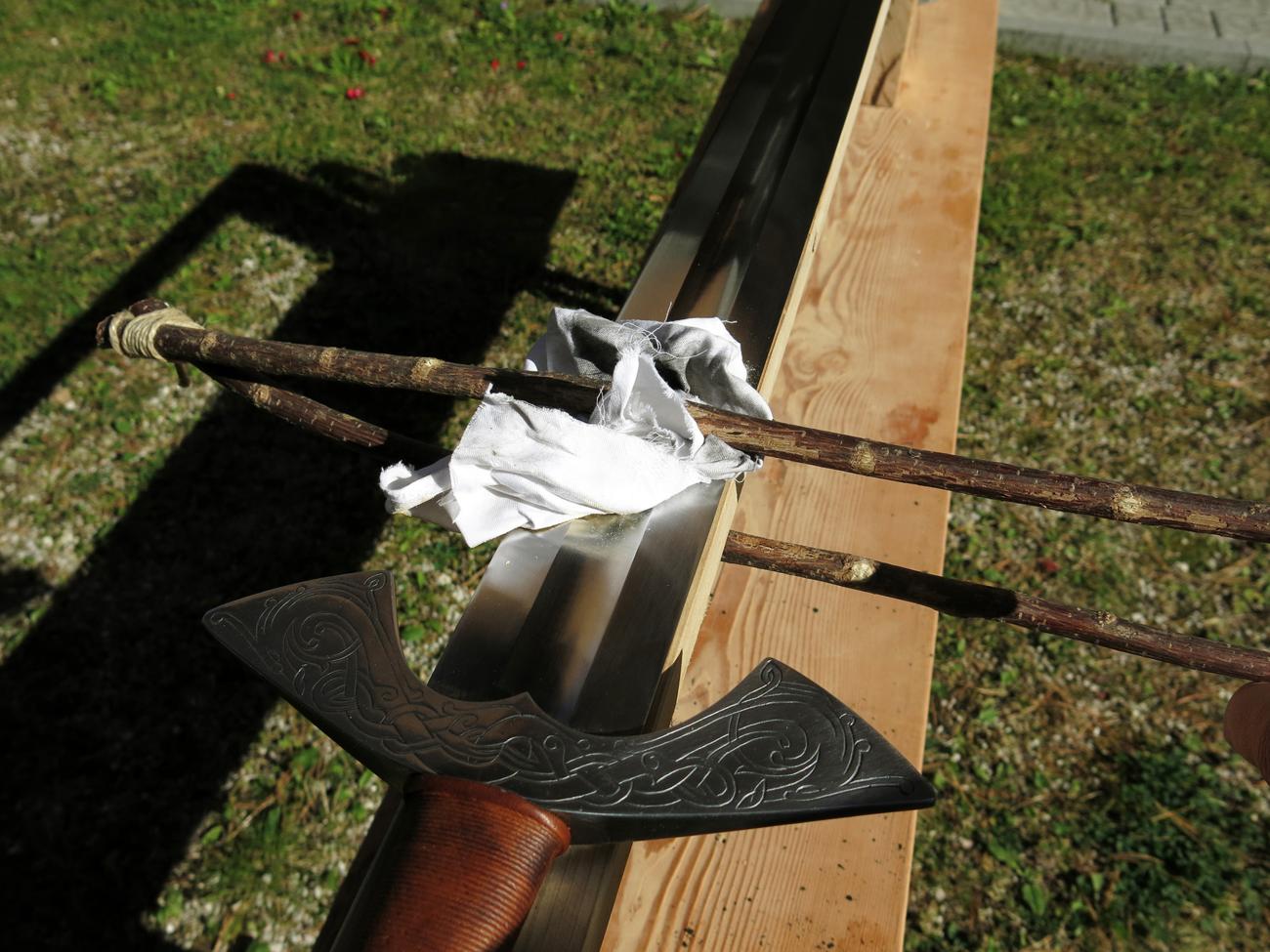 A little headache was the correct fixing of the sword on the working surface when working alone. This was solved by fixing the hilt with a string to one of the uprights and attaching a wooden clamp to the tip of the sword. Since during polishing there was only movement along the sword and not to the side, the weapon remained stable. When polishing in two it became obvious that the sword could be fixed to each other: While one person polished the back part of the blade, the second person fixed the weapon with the polishing tool at the tip and vice versa.