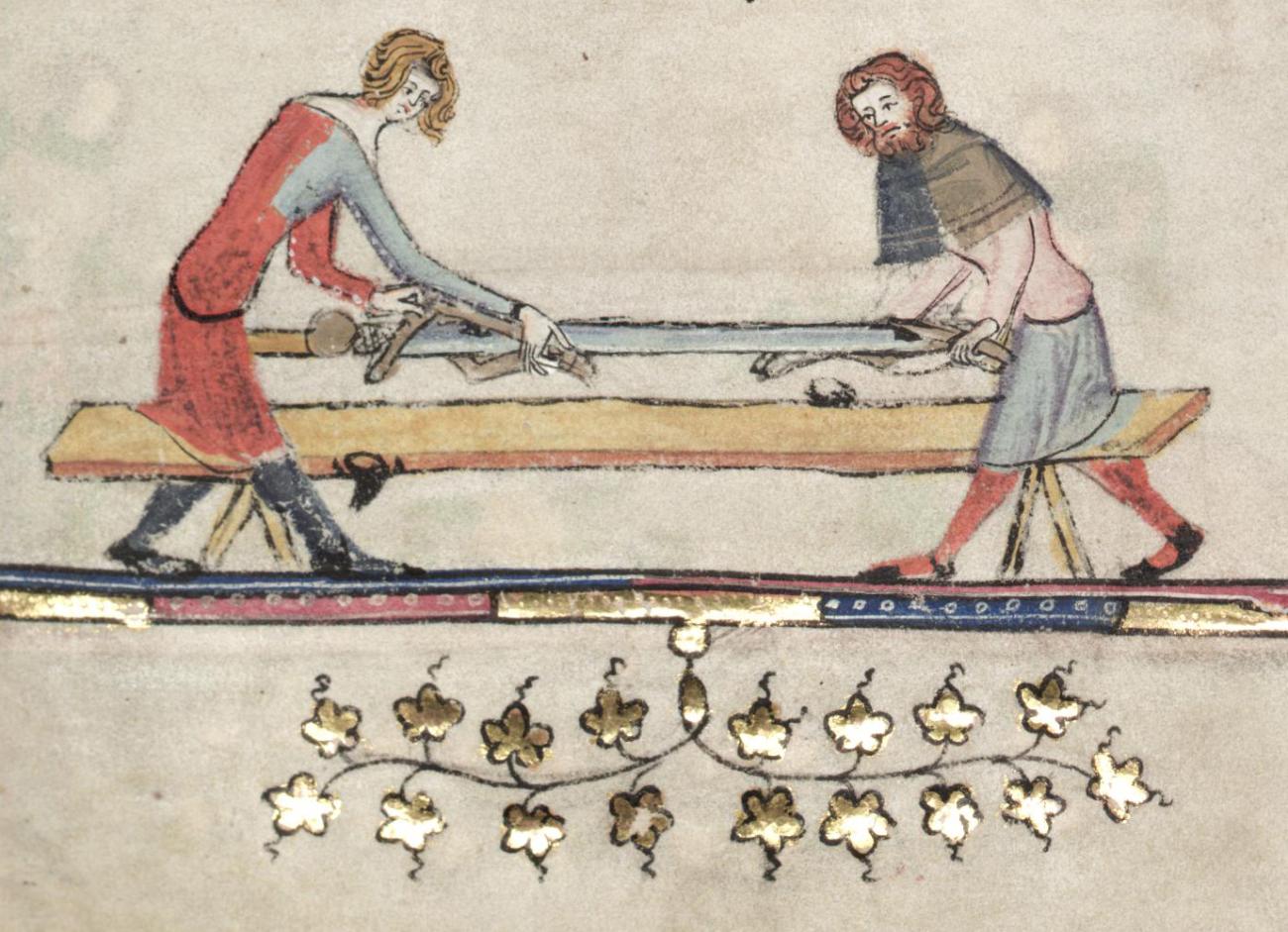From the High Middle Ages onwards, the design of the polishing bench changed. In the Codex MS Bodley 264 of the Oxford Library there are two illustrations (See Figures 3 and 4, MS Bodley, 264, 1300, fol. 49r and 113v) of polishing benches, which are used by two craftsmen each. Here an additional raised working platform is mounted on the low polishing bench. This changes the tool from a simple stick to a clamp like tool consisting of a stick and possibly a belt. The new design allows the tool to be guided better and to be more stable. But the strange hand position is still the same. While at the polishing bench on fol. 49r the left figure has a whetstone/steel fastened in the tool, the two craftspersons on fol. 113v, have dark objects between the tool and the surface of the sword, possibly leather or textile rags.