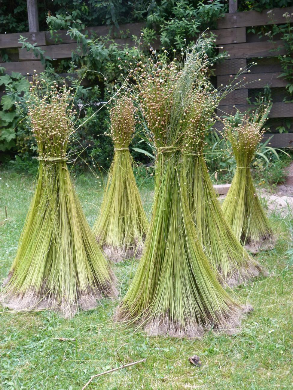 Early Egyptian wall paintings show the flax plant being harvested by pulling the plant out of the ground root (Klebs, 1915, pp.54-55) and all, a practice that has survived to today. The plant’s taproot means the plant can be extracted from the ground easily and the full length of the plant fibres is available for processing. If the stem is cut this encourages bacterial growth causing an uneven retting of the flax (Birkigt-Quentin, Busse and Schäfer, 1995, p.8). The pulled flax is set up in bundles, like little chapels, and left in the field to dry. It is not left to dry flat on the ground, because there is a chance that retting would begin (Fasse, 1989, p.19; Kuhnert, 1920, p.75). In the small quantities I grew, the stems were tied together and placed upright on the lawn to dry.