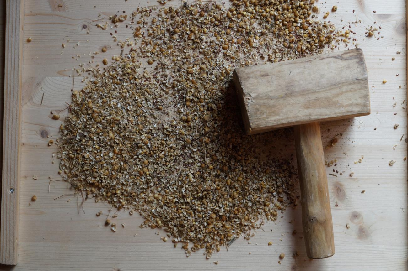 In my experiments, I tried to remove the seed vessels with a mallet on a worktop. In theory this should work well but both the weight and shape was not very suitable, because the weight of the mallet means one must be very careful not to crush the seeds. My best results have been with combing the seed vessels to remove them.