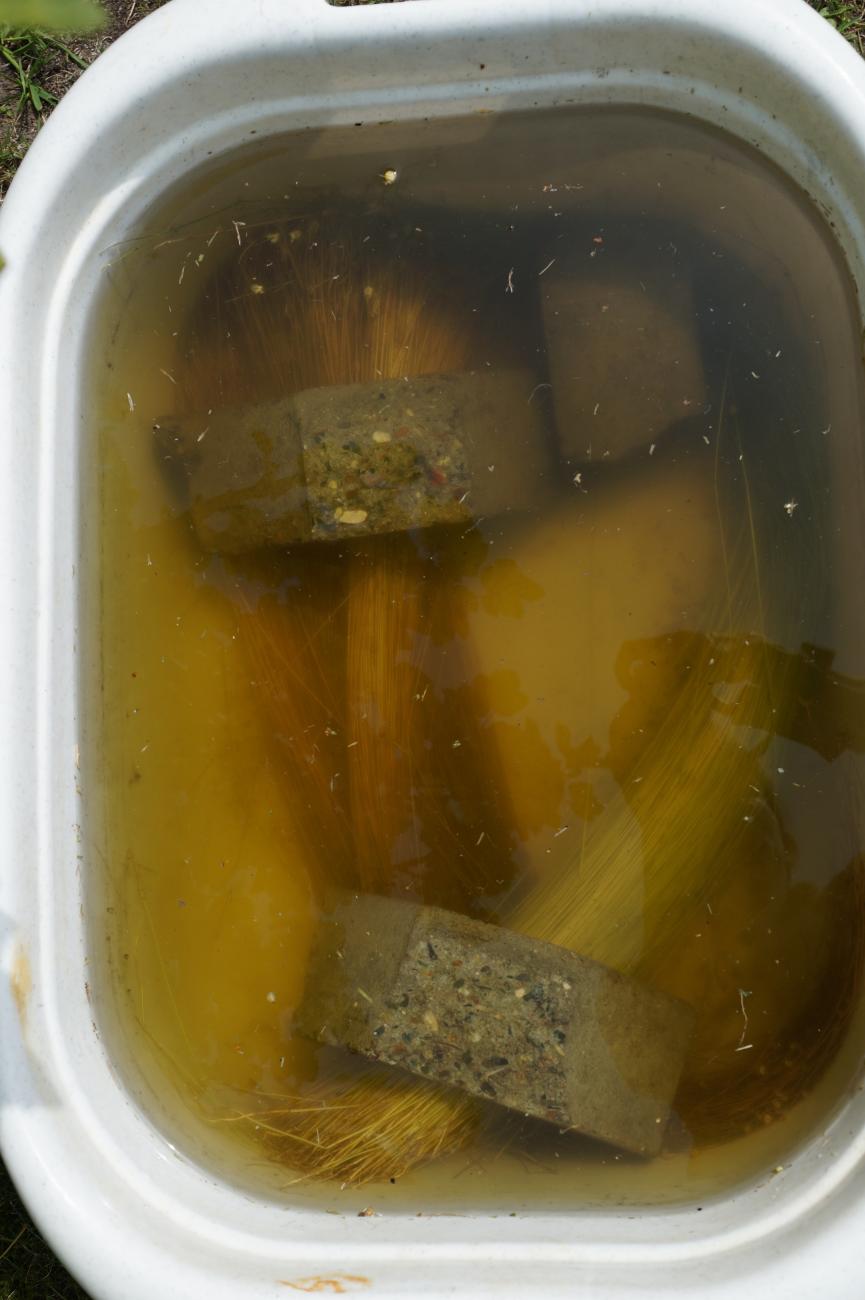 I used a large water tub for my experiments. An observation I had was that the batches using rain water rather than tap water achieved better results. Water retting seemed to take less time and the fibres were brighter and more uniform, than those achieved with dew retting.