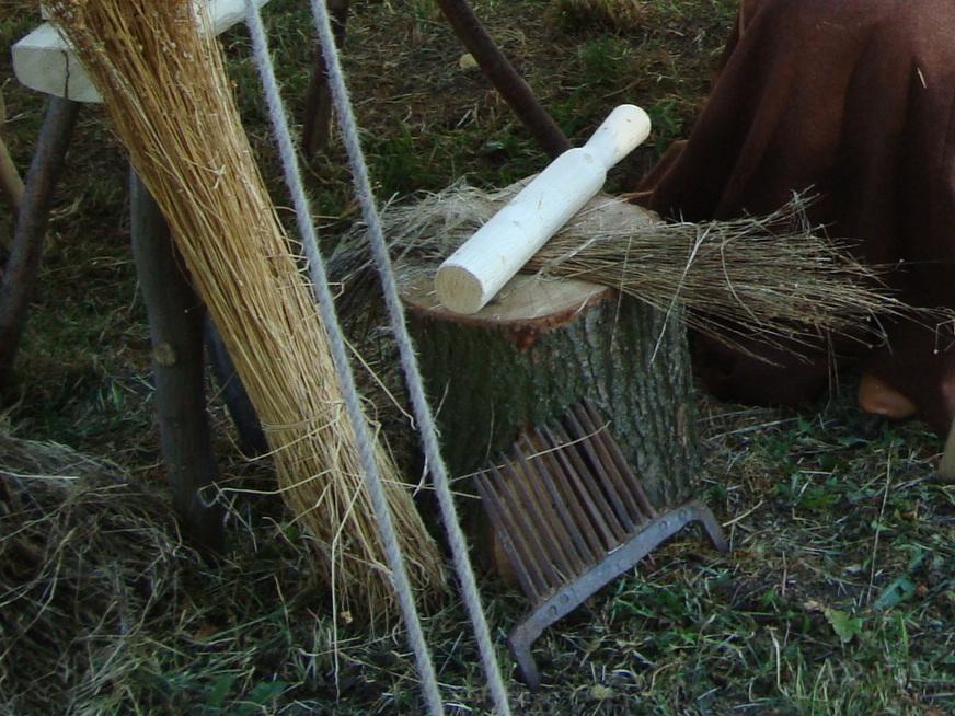 There are 13th century songs about scutching. The Kunkel house fresco shows a woman who is probably scutching and labelled “Thesens”, which is somehow connected to scutching (Wunderlich, 1996, pp.53-54). However she has the flax simply lying on her thighs and a scutching knife in her hands. My experiments with this method were not very successful, though I may lack some information or just practice.
