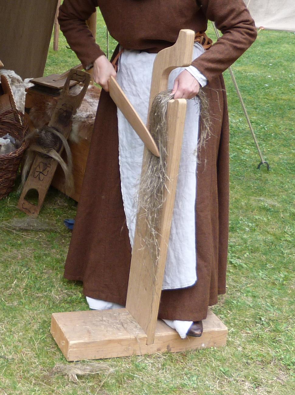 House Zur Kunkel and the cathedral from Chartres have depictions of hackling. The hackling comb itself has the shape that has survived to today. In the middle of a longish board, there is a round block with tightly fitted pointed nails. The flax is pulled through the comb to remove shives and short fibres. Unlike modern hackling were the comb is clamped into a light wooden frame, medieval depictions show women that have the hackling comb pressed against their knee.