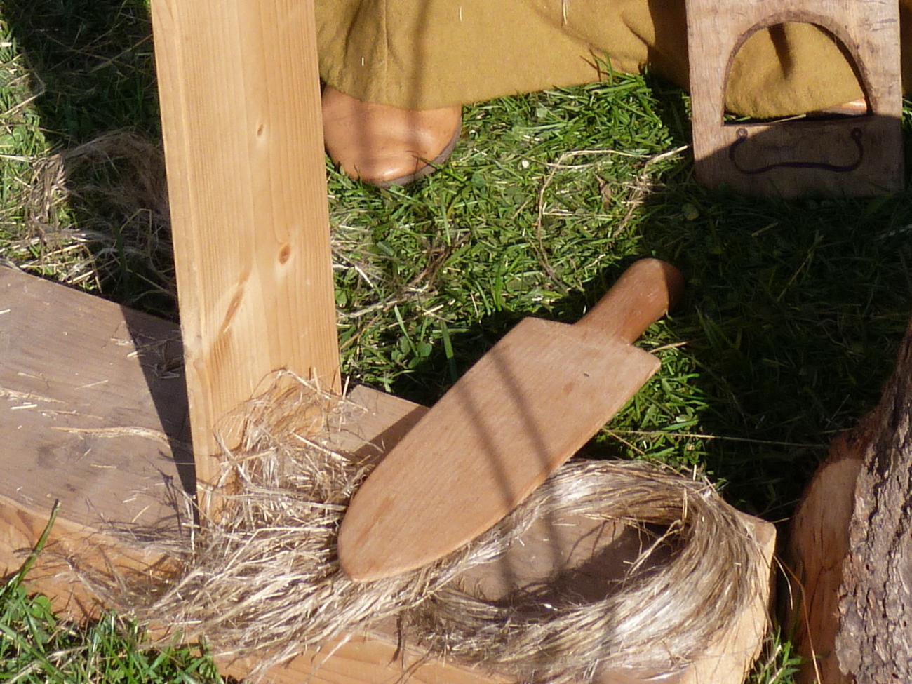 We have replicated the tools from the depiction in Wienhausen and from the find in Braunschweig. Scutching, as with breaking, is very exhausting work. However the last remains of the shives can be removed effectively and the fibres loosened and aligned.
