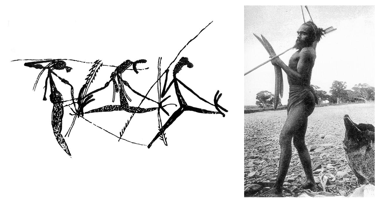Despite these differences, these two weapons coexisted for at least the last 10,000 years in Australia, if we refer to some ancient painting in Arnhem Land which shows scenes with hunters holding both type of implements (See Figure 1, left). In more recent historic times, Aboriginal hunters frequently carried both weapons, showing a complementary use as the throwing stick could also be kept either as a second projectile or as fighting weapon to be used at close quarters (See Figure 1, right). On another hand, weapons and tools with multiple functions are common in Australia as Indigenous people needed to minimise their burden during their frequent moves through their country. Some weapons can be used as tools (e.g., spear throwers or throwing sticks equipped with adze extremities, spear throwers that can be used as shields), as a close quarter melee weapon, as a projectile (throwing sticks) or as projectile launcher. In this context, it will be not surprising to observe the intersection of function between throwing sticks and spear throwers in particular Aboriginal implements.