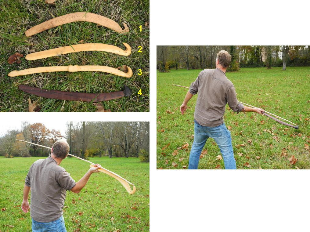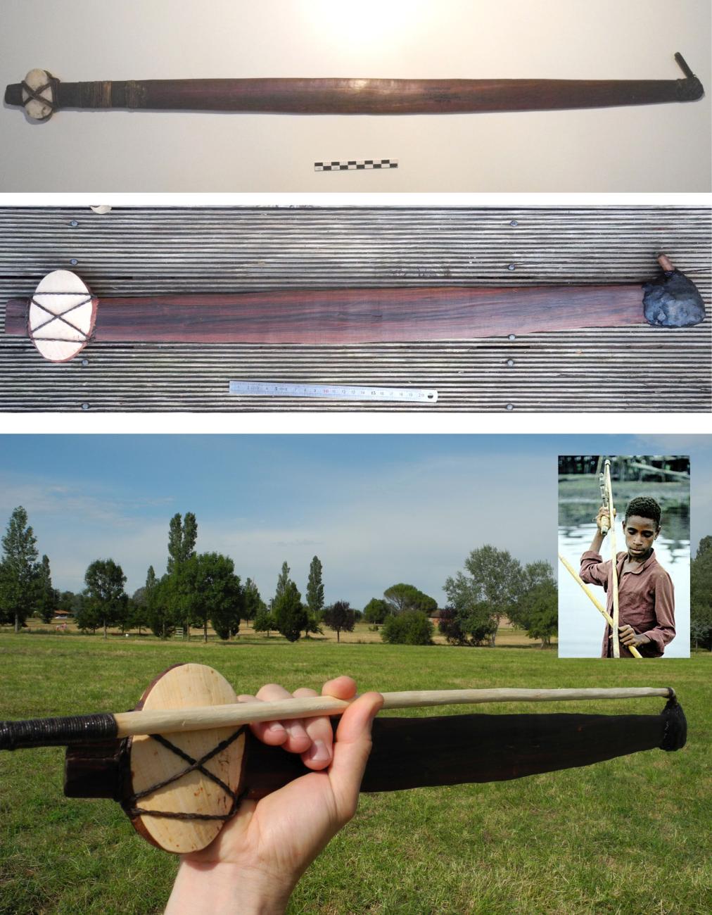 Fig 10. Replica of one “on edge” spear thrower of Queensland (middle) after one example from Pitt river museum, wingspan 72 cm (top). Shifted way of handling the spear thrower and shaft (bottom left). A Papuan man using the spear shifted technique, holding the projectile against the holder (http://www.thudscave.com/npaa/tips/pngthrow.htm) (bottom right).