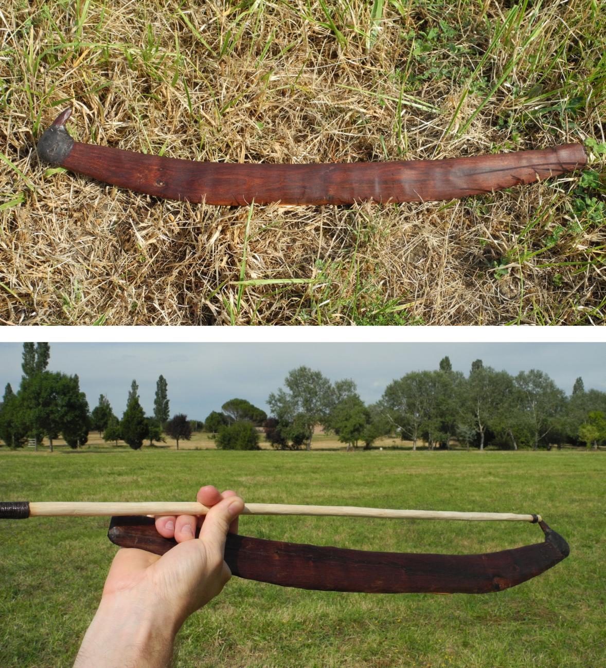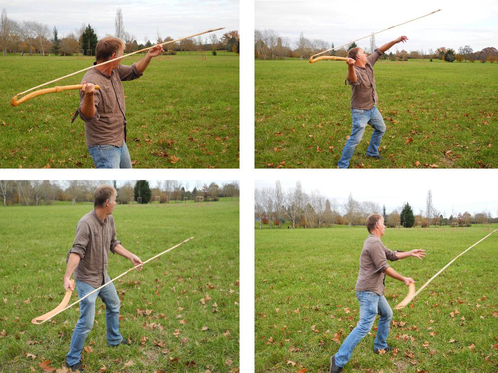 Compared to the previous implement type used, the disadvantage of this type of spear thrower/throwing stick is that the hook is oriented towards the exterior of the curvature, setting the elbow as an awkward location to position the spear shaft when trying to use it as spear thrower in the same way as “on edge” built spear throwers (See Figure 12, bottom left). On other hand, throwing sticks benefit from being curved which ensures a certain stability in flight. This curvature can be either gradual or elbow shaped, according to their form. To solve this problem, I managed to set the hook into the butt of the spear and to set its shaft on the exterior of the curvature, different techniques of launching were tried.