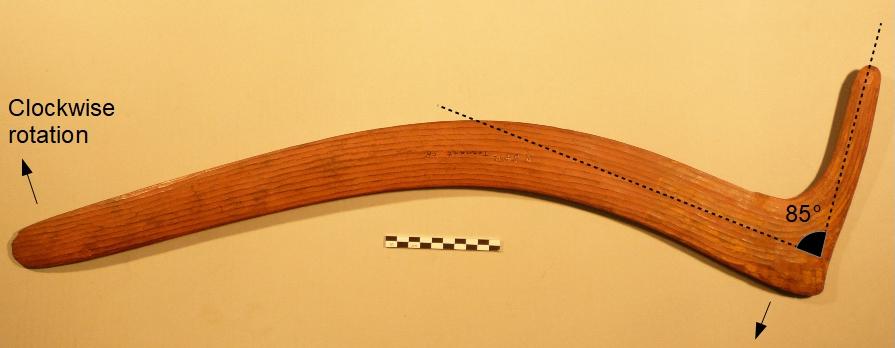Another less common type of hooked throwing stick had been made in the Coopers Creek region near Lake Eyre, extending north-east in South West Queensland (See Figure 4). On the drawings reported by Davidson, it's possible to observe slightly curved throwing sticks, probably with circular or elliptical airfoil, having a short hook extending the following blade opposite to the holding blade and oriented toward the exterior of the curvature (See Figure 2, top, d-e).
