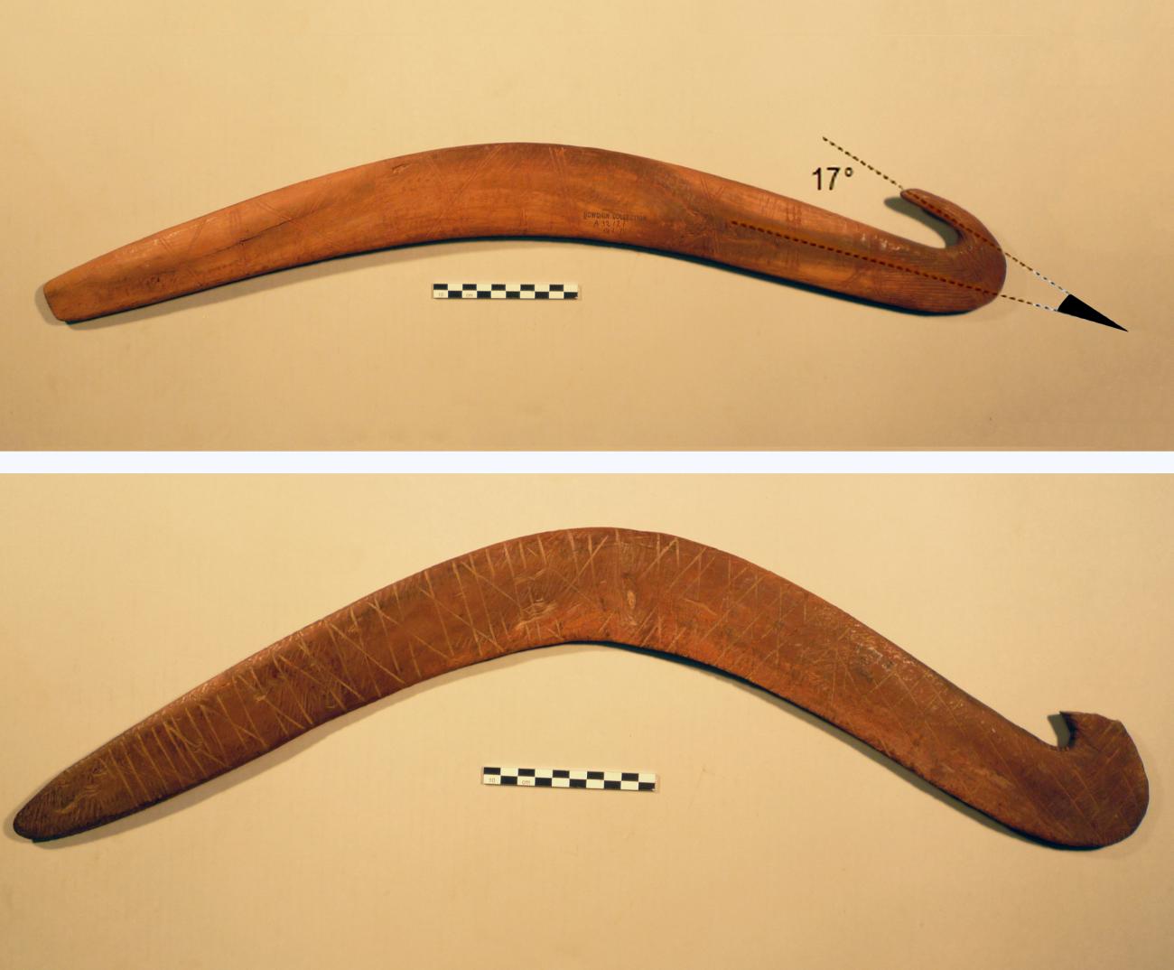 From the ethnological information provided by Davidson (1936a) about these particular hooked throwing sticks, we know that they have been considered as ceremonial objects in the last two hundred years. This symbolic use is confirmed by a very large fully painted ceremonial example exhibited in the South Australian Museum which is so large and heavy (more than two meters long and likely weighing several kilograms), that it would be impossible to wield efficiently, even more so as a projectile (See Figure 7, top). However, interestingly, this museum artefact has the same shape as the smaller older model presented by Davidson (1936a), including a variation of the notched feature at mid length (See Figure 2, bottom left).