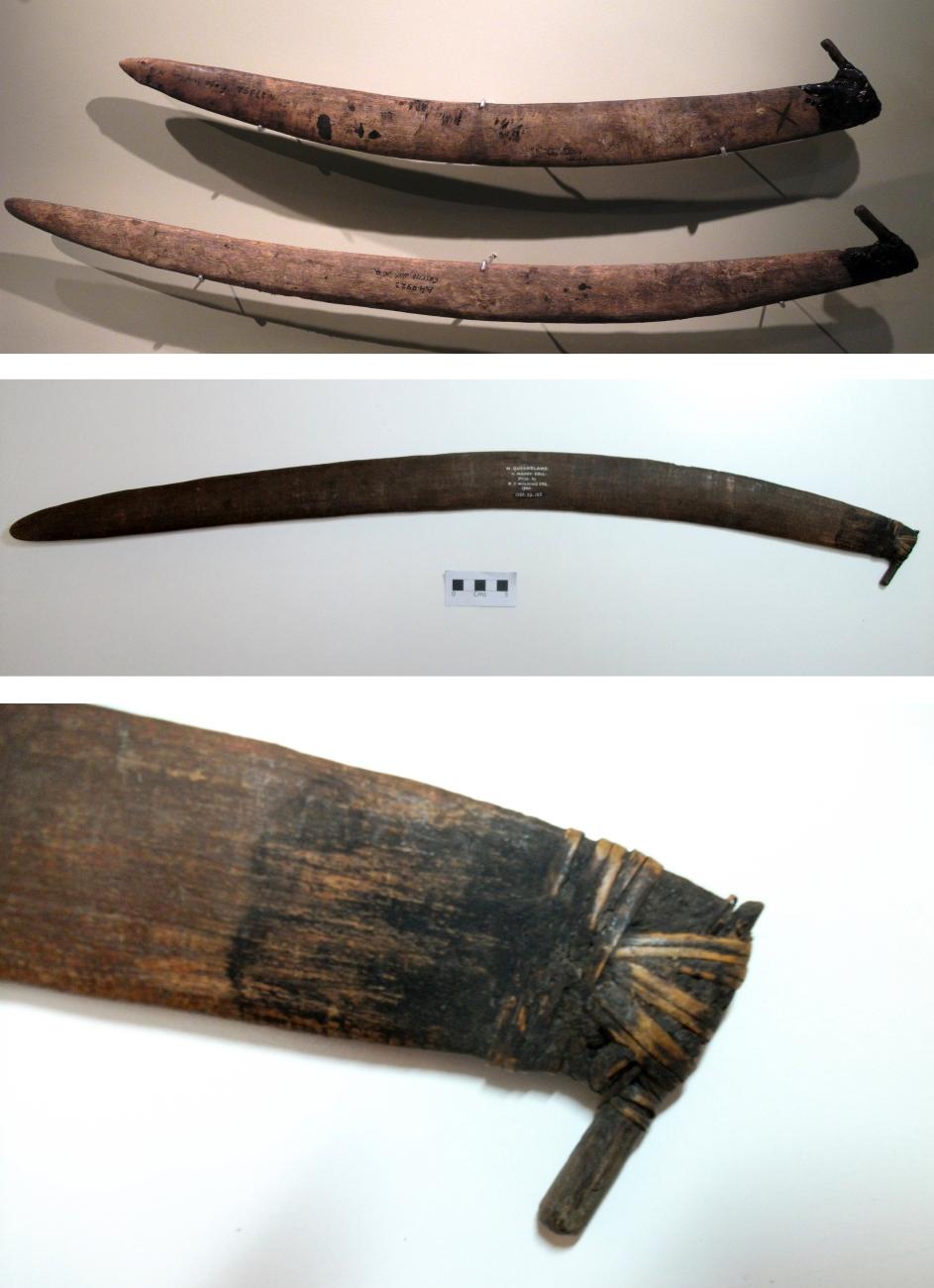 Some types of curved spear thrower, which appear at first glance to be variations of the same type, are from Bloomfield river to cape Grafton in the coastal North Queensland region (See Figure 4) (Davidson, 1936b). They also share the “on edge” built spear thrower tradition of binding the peg with a tendon or natural plant fibre through a drilled hole in the extremity, which is unique to this region (See Figure 9, bottom right). Careful examination on these implements reveal that they are so similar to throwing sticks, made through the addition of a peg on a modified extremity, that they are probably either throwing sticks converted into spear throwers or are spear throwers which are directly derived from these curved projectiles (See Figure 9).