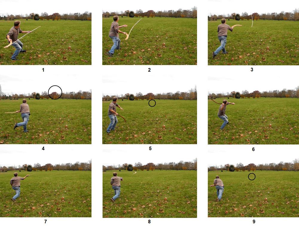 I also tried both previous launching methods with two different positions: vertically, with the stick and spear passing over the shoulder, and horizontally, with both passing on the right side. I found that the horizontal position was more comfortable because of the superior weight of hooked throwing sticks, which require more effort to use over the shoulder (See Figure 13, top). This horizontal movement seems also to be more natural with hooked throwing sticks as it is the classic movement of launching throwing sticks too. This horizontal technique using both hands was very comfortable to hold before launch and succeeded in throwing spears at mid-range (30-50m) (See Figure 13, bottom and Figure 14). As can be guessed, throwing spears with hooked throwing sticks which have accentuated curvature (See Figure 12, top left N°1, Table 1, N°1) were more difficult compared with those having lower curvature (See Figure 12, top left N°2-3, Table 1, N°2-3).