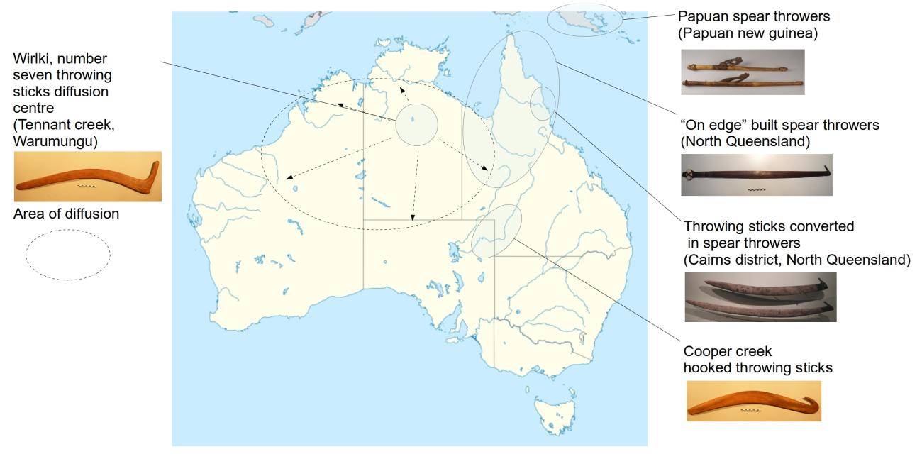 Two very different types of hooked throwing sticks existed in Australia (See Figure 2, top). One of the most famous types is the number seven, or beaked, throwing stick (See Figure 2, top, c) produced in a region located between Tennant creek and Katherine, especially by Warumungu people, and spread throughout all Northern Australia as far as Western Queensland and Kimberley or from Carpentaria Gulf to Southern Australian coast (Davidson, 1936a; Leroi-Gourhan and Deffontaines, 1949), (See Figure 4). However, it's probable that the maximum extension of this diffusion had been reached only in recent times because the specimens made on the boundaries of their diffusion zone often lack the flutings or are more crudely made (Davidson, 1936a).