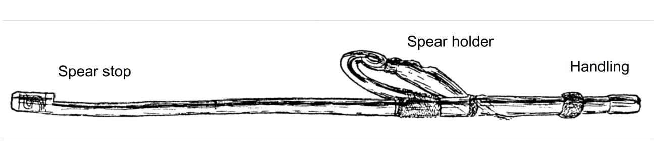 This propelling system, when used to throw a spear at a high velocity and great distance, was particularly adapted to hunt large herbivores. A spear is set on a notch or a peg at one extremity of the thrower, which then pushes on the butt of the spear shaft. Held in the hand, the result is to extend the arm and thus increase the propulsion of the spear (Calvin, 1974).