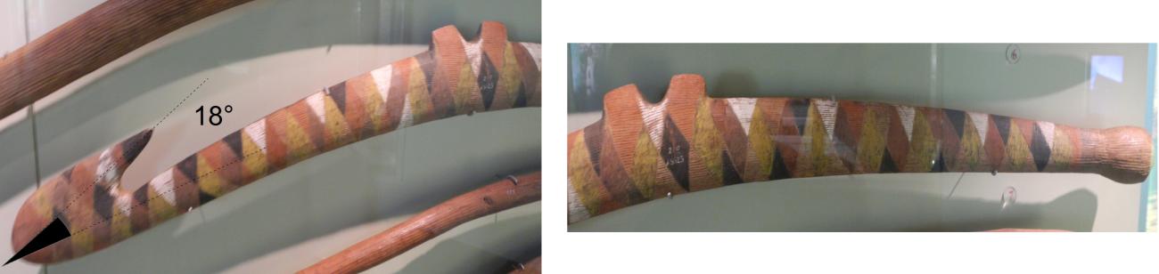 We can measure on these particular objects presented by Davidson that the hooks are built with a rather sharper angle, around 20° (See Figure 2, bottom), so are not overlapping number seven beaked throwing sticks which have a more open angle (See Figure 2, top, c and Figure 3).