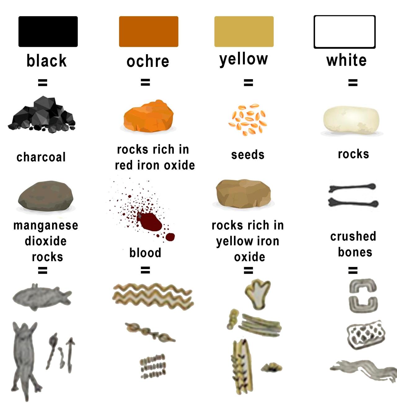 According to Ribeiro (2006) and Moeri and Salvador (2017), the colour palette used in the rock paintings of the Peruaçu River basin follows the material composition presented in the Figure 10.