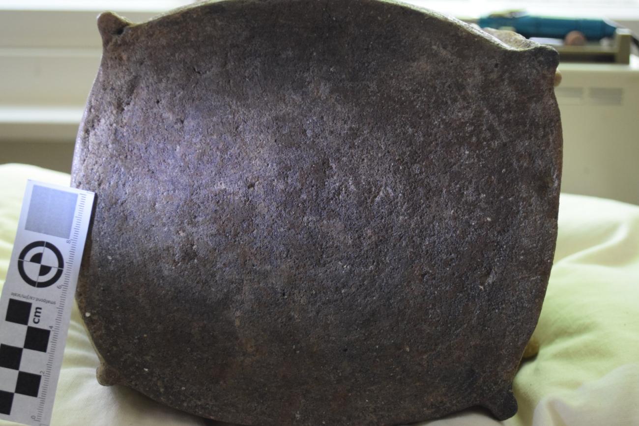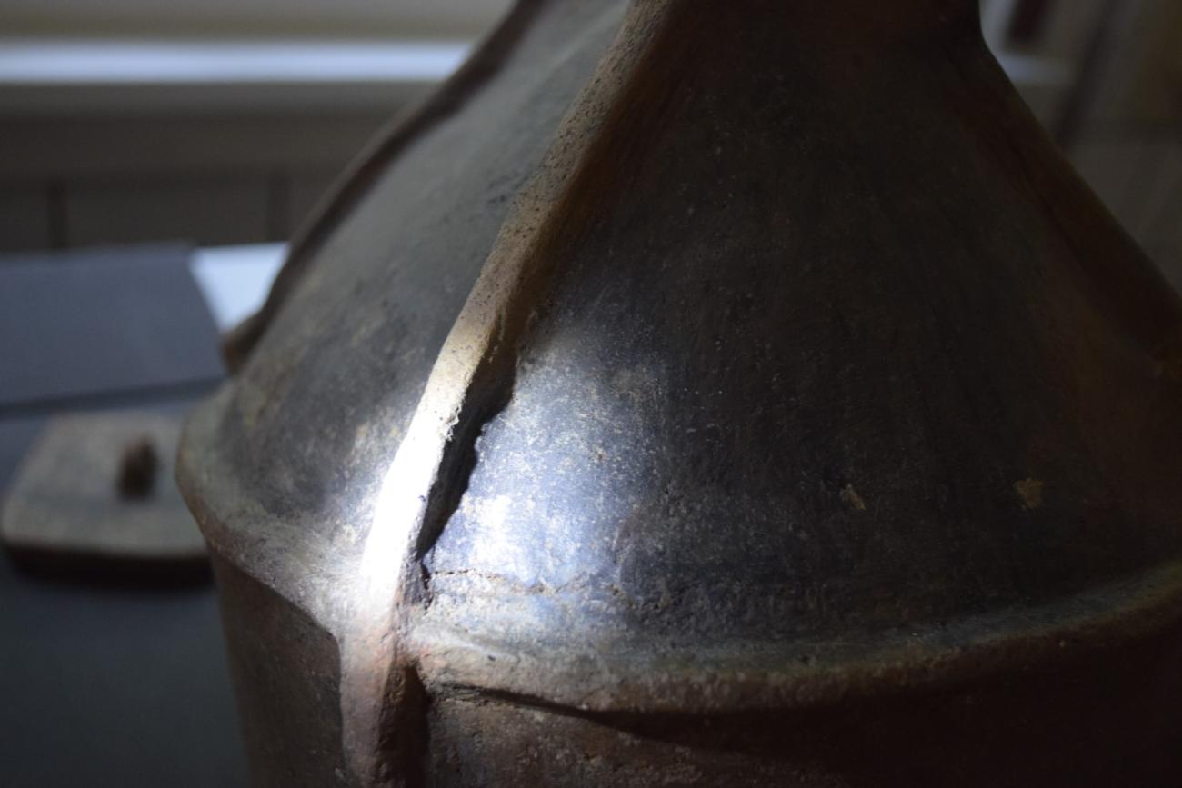 Closer examination of the surfaces of the urn showed several areas of interest, and it was determined that the urn was likely constructed from base to roof from coils of clay. Traces are present where two horizontal masses of clay were joined together, visible as linear crevices on some areas of the wall about 5cm from the base (See Figure 3), and then repeated first 1-2cm and then again 4cm above the horizontal ridge marking the boundary between wall and roof (See Figure 4). These traces coincide with currently-mended fractures in the ceramic body, although the evidence for breaks and the evidence for forming traces can be differentiated. It can be surmised that these fractures formed along existing lines of weakness where the two clay masses were insufficiently integrated with one another prior to firing. The base, which was not broken, also shows these linear crevices which broadly follow the curve of the outer base edge at 1.5-2cm from the base edge (See Figure 5). Additionally, by using one hand to feel the inner surface and the other hand to feel the corresponding outer surface simultaneously, it was possible to feel that these various crevices aligned with horizontally-oriented regions of thicker or thinner areas of wall thickness.