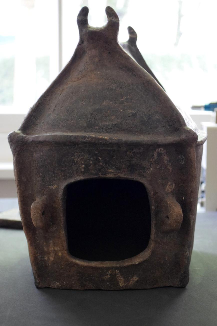 This particular example is in the form of a house or hut with an ovoid to rectangular footprint (20.5x18.5cm) with four convex walls (26.6x23.0cm at their maximum dimensions), and is light- to dark-brown in color, fitting within the category of ceramics called impasto. The vertical corners where the walls meet are each marked by a single, raised ridge projecting outward. At the point where the upper wall meets the lower roofline at the eaves, another raised ridge was added horizontally around the full circumference of the house. From this horizontal ridge, the roof extends to its peak. While the gable ends are each convex as is the case for the walls below the eaves, the roof itself transitions from gently convex in the lower half to gently concave in the upper half. The peak of the roof is marked by a slightly wider ridge which has been interpreted to resemble a ridge pole. The two ends of the peak have projections resembling an upward-oriented crescent moon (as suggested by Gnade, 1994, p.235) or horns, giving a maximum height of 30cm. When viewed from above, the peak of the roof is slightly out of alignment from paralleling the longer axis of the urn (See Figure 2). On one gable side, three vertically oriented tabs project from the wall, one in the center and the remaining two on either side of a removable door. The tabs are pierced and when the door is put in place these holes align, allowing for a narrow bar to be inserted, holding the door in place.