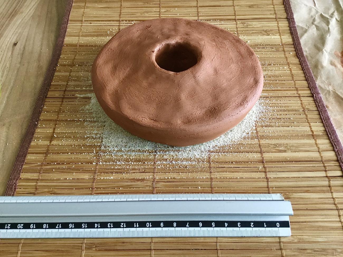 Based on macroscopic observations, the loom weights appear to have been modelled using multiple techniques, and with the aid of tools such as a potter’s wheel, a stick, and a mold. In the case of the second technique, a colombino, or a 6 cm thick and 40 to 50 cm long clay roll (See Figure 4) is arranged in the shape of a doughnut and pressed in a concave mold similar to that of a bowl, but of which the diameter is greater to that of the loom weight itself (See Figure 5). The rest of the process is then undertaken on a wooden desk and the loom weight is modeled on its sides into a biconical shape. In the case of the first technique, a ball of clay, created by tapping the clay with the palm of the hands, was placed on the wheel. The central hole was created by using a stick, of about 2 cm in diameter. Vertical pressure and rotational movements are used to widen the hole and the final refinements are rendered with the fingers.