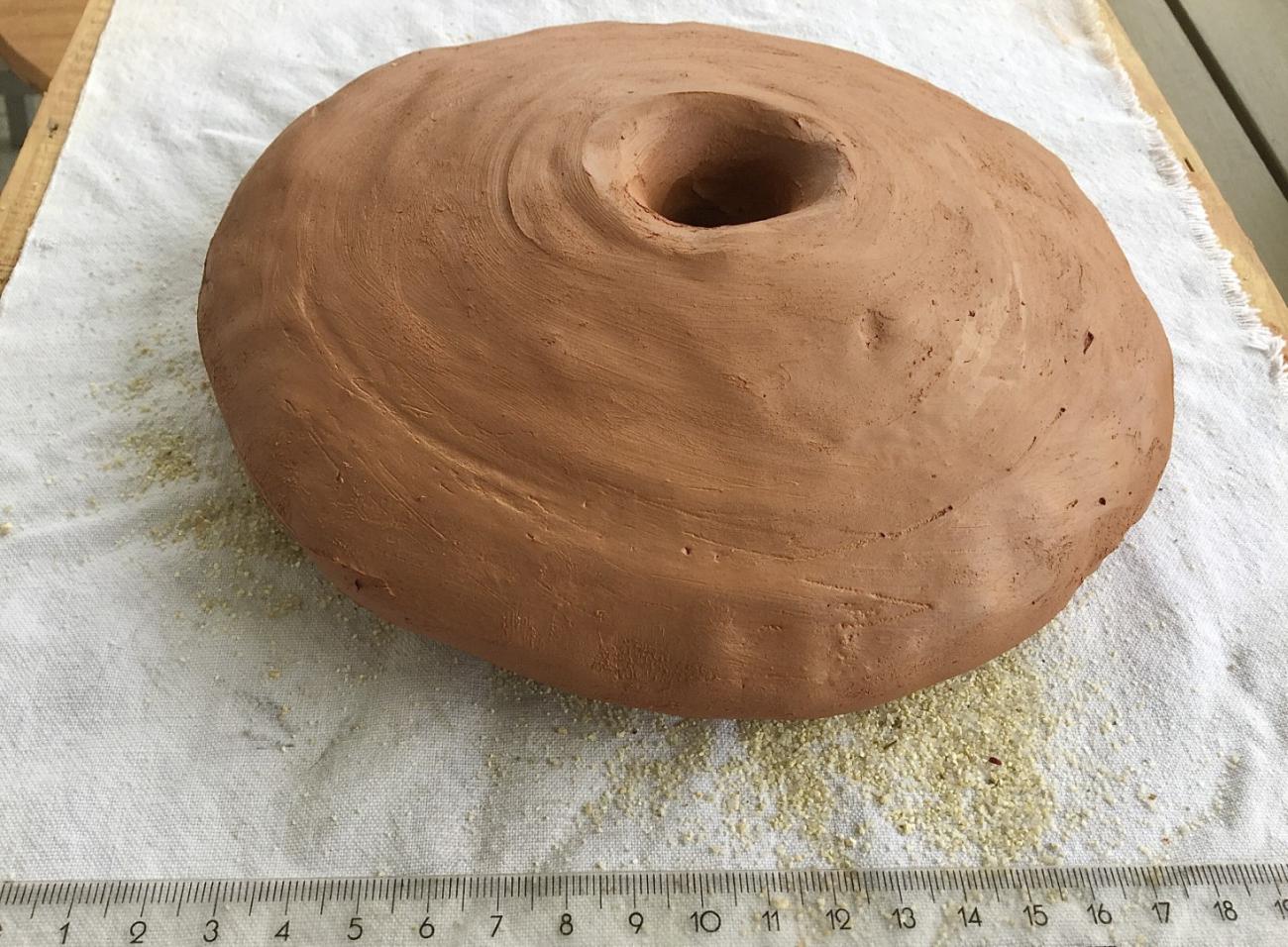 LW2 is the second heaviest of the three discussed loom weights in. It differs from LW1 in its slightly biconical shape on both sides. This means that the cross section thickness of the outline has sharp edges, and is less rounded than the classic doughnut-shaped loom weight. Nevertheless, the material, size, diameter and thickness are almost identical. The loom weight was made of a raw mixture weighing 10% more than the original 1.310 g, thus 1.441 g. Of the 1.441 g, 1.225 g (85%) consisted of clay and 216 g (15%) consisted of grog. A 6 cm thick cylinder was modelled by manually wedging the clay to remove all trapped air. A 6 cm thick cylinder was modeled by wedging and pressed inside an 18 cm diameter bowl shaped mold. The work process was completed on the desk, by rotating the doughnut loom weight on either side, thus obtaining the biconic outline. Throughout this process, it was observed that the central hole of the loom weight developed with an uneven surface as opposed to the hole created with the stick on the wheel, as with LW1. However, the result of the external outline is rather successful, as it reflects the smooth and angular characteristics of the original loom weight’s outline (See Figure 7). It cannot be ruled out that molds were used to shape the doughnut loom weights. In this experiment, the mold was successful for this purpose. During the modeling process, a 1 cm margin was added to the measurements to allow for the loss of 10% volume once dry. No engraved symbols appear on LW2 and thus the replica’s surface was undecorated. The loom weight was then left to dry for thirty days on a wooden surface, covered with white cotton fabric and lightly sprinkled with filtered sand.