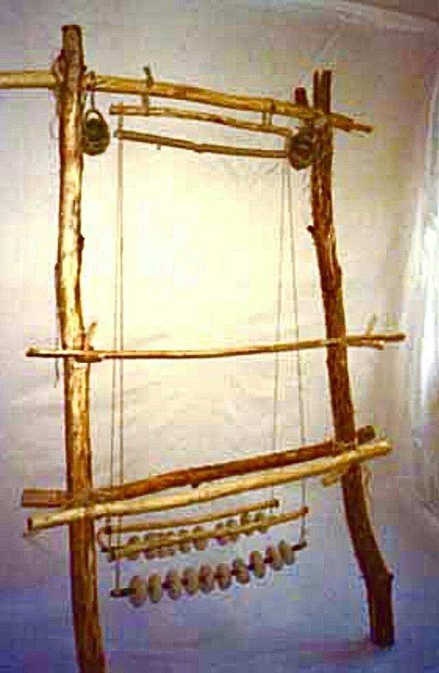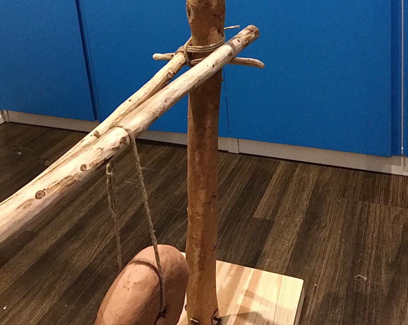 This weaving loom consists of a combination of two types of weaving looms: the warp-weighted type and the double beam type. Two of the three reconstructed giant loom weights, LW1 (1,346 g) and LW3 (1,543 g), were not attached to the warp threads, but were rather used to weigh down the lower beam on which the warp is wrapped.