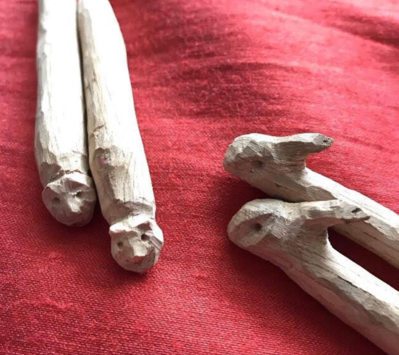 To begin with, the quadrangular bases were created (See Figure 9). They measure 30 cm sideways and consisted of four panels of seasoned pine. Pine was the only material purchased for the reconstruction due to its dry and resistant qualities and because it further ensures the final stability of the weaving loom. The quadrangular panels were glued together, two by two, and manually perforated centrally to insert the vertical poles. Two vertical poles of 165 cm in length (See Figure 15) were worked with a small planer blade to obtain a clean, smooth and aesthetically pleasing surface. The two poles were then perforated on both sides using an awl, gouge, and wood gimlet, at regular and symmetrical distances. These holes were used to accommodate the wooden pins which support the beams of the weaving loom. After this, the vertical poles placed within the hole were anchored to the bases with metal fasteners and decorative nails. These elements were both present in the Roman period in wooden buildings and building constructions in general. A small connecting beam between the two vertical supports connects the bases and allows the weaving loom to be adjusted, controlling the front position and the alignment of the entire structure. The 80 x 6 cm connecting beam was made from seasoned wood that was perforated and connected to the bases with hand-carved wooden pins (See Figure 9). Two beams, measuring 140 cm and 125 cm were cut and planed to support the warp and loom weights. The wood chosen for the beams is especially suitable for the tension and movement of a weaving loom, due to its elastic characteristics. An additional beam of 125 cm long was made using the same technique and was placed on the back of the weaving loom on the opposite side of the lower beam. The lower beam and the back beam were tied tightly on the poles with a plant fiber rope (See Figure 11). All the pins used in the reconstruction of the weaving loom were hand carved, with some featuring decorative carvings. They were made to measure with the placement hole and serve to support the beams (See Figure 10). The two middle pins were forked, in order to carry out the standard back and forth motion of the heddles.