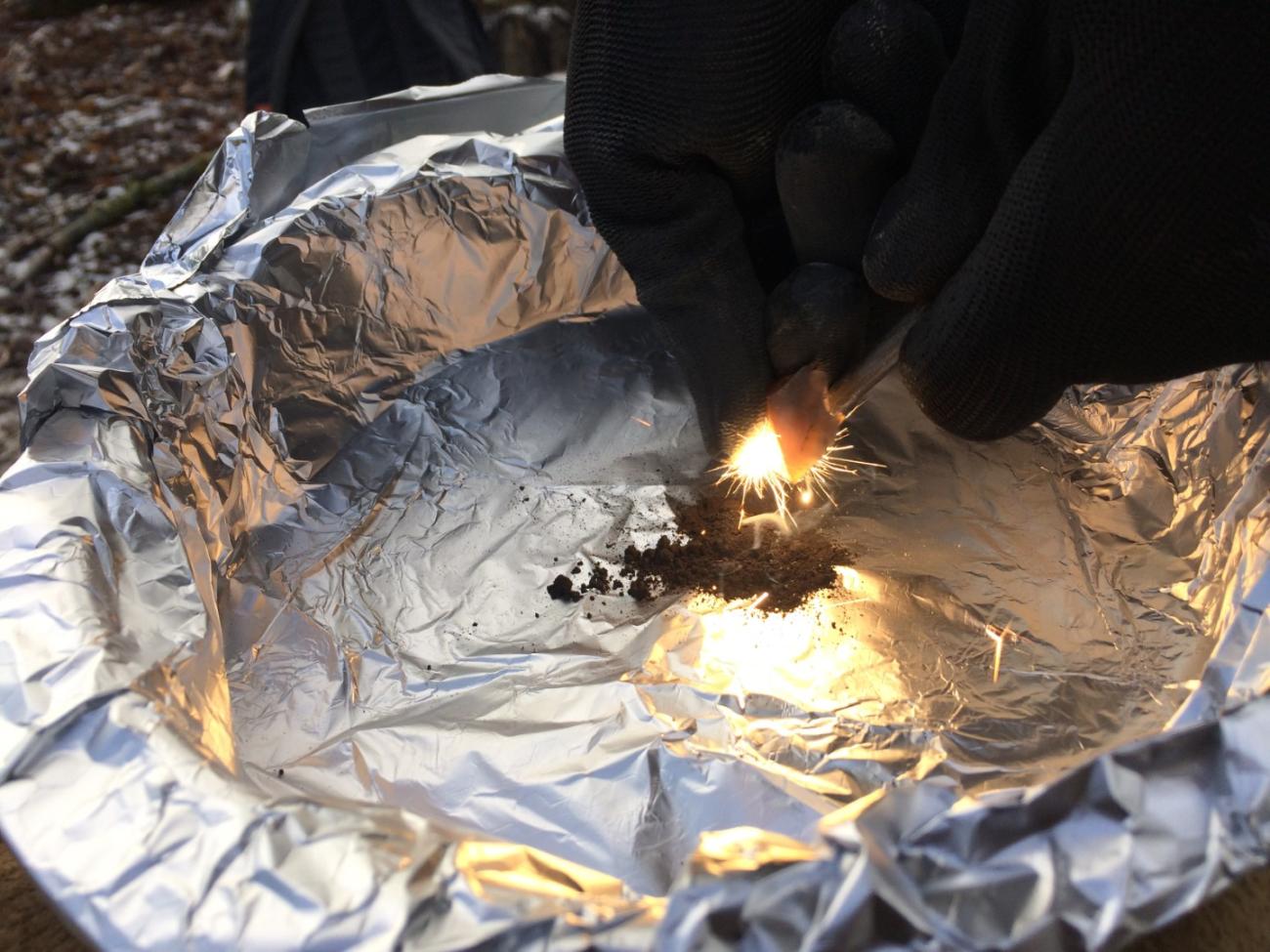 The results of the experiment failed to validate the model put forward by Hayes et al (2016). While the actual experiments do not in themselves disprove the use of MnO2 as a fire lighting aide, they do raise questions about the exact specifications of its use. Birch is an excellent firelighter, due to the concentrations of triterpenoids within the bark, so it was surprising to see that it failed to catch a spark when combined with MnO2, despite it lighting by itself in the same scenario. This indicates that there may be a critical threshold for the efficacy of MnO2 within an amount of tinder, above which it hinders the reception of a spark. This may simply be due to the competition for surface area. The use of the ferrocerium rod also rules out the use of colder pyrite sparks as the mechanism of ignition. In contrast the reignition of the birch tinder in the second experiment does support the theory that heated MnO2 generates additional oxygen which might slowly collect in pockets within the tinder, allowing for a cooler temperature of pyrolysis to rapidly increase and reignite. The smoke produced from the final round of birch tinder is an interesting phenomenal addition to any interpretation of MnO2 use with fire, since it suggests that adding it may change the quality and colour of the smoke. This could be done deliberately in order to create a special or unusual effect, perhaps as part of a wider toolkit of artwork and body modification.
