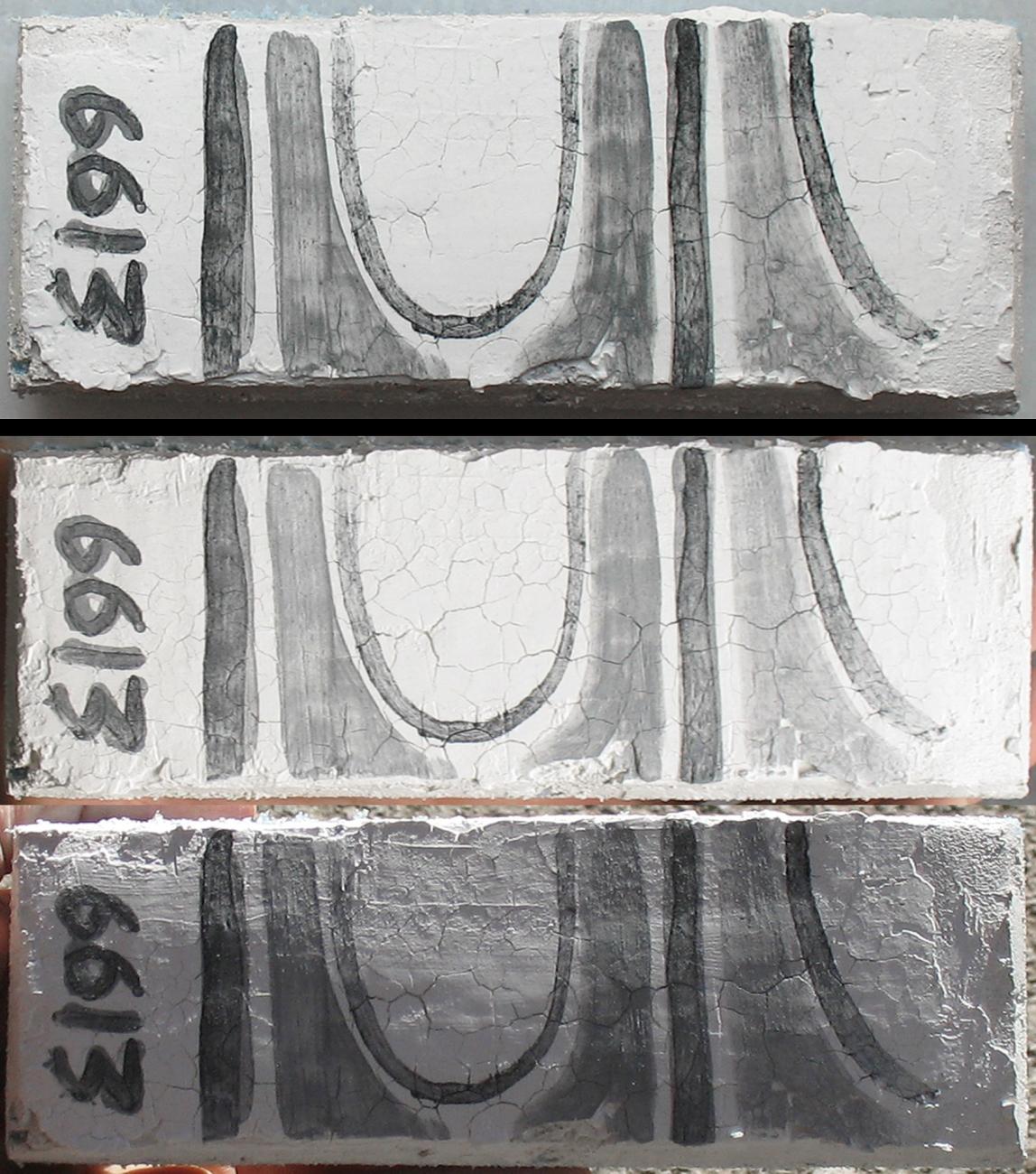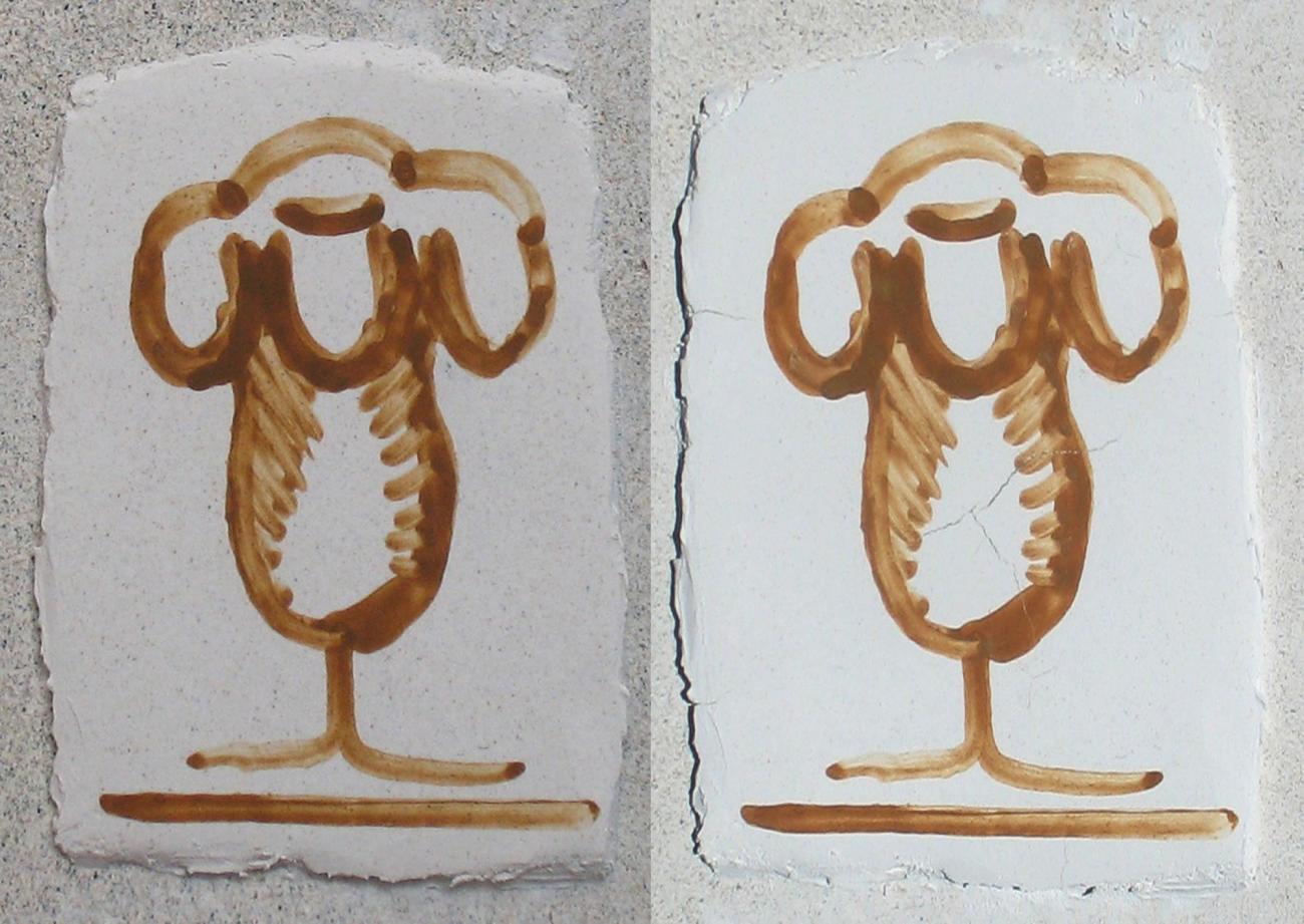 We undertook a small number of experiments with mixtures that contained a small quantity of fragments of mortar (1/3rd-1/6th of the mixture). These quantities proved enough to influence its behaviour: the lime mortar produced dried faster than a mixture of lime and sand because the fragments absorbed part of the humidity of the fresh lime. When we wetted the dry samples we observed that absorbed a bit more water than normal mixtures of lime and sand did. All of the mixtures with fragments of mortar were used as base coats for other lime mixtures that were painted (See samples 15713 Abduction; 15713 Roman Venus; 2813 Palmette Persephone; 5514 Aineia Lily; 5714 Lily; 25714 Pluto; 26814 Palmette). The surfaces of the base coats were sanded to improve their mechanical adhesion to the top coats. The mixtures placed above them did not develop cracks or other forms of damage that can be attributed to the basecoats (See Figure 3). Fragments of mortar can be used as aggregates in a lime mortar, but it is better if they are a small part of a mixture and not the sole aggregate.