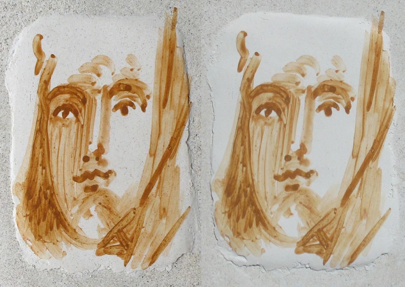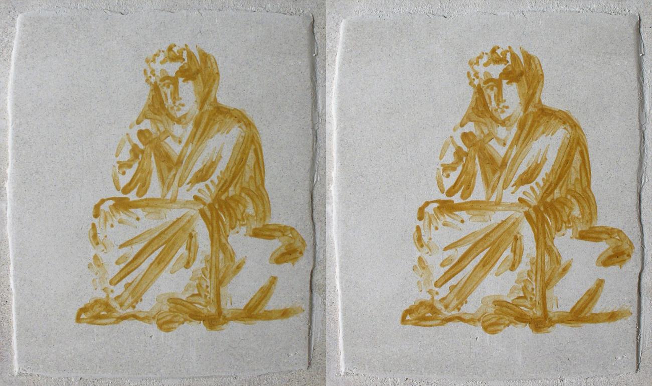 In a small number of experiments we tried to create a mortar by mixing dried powdered lime with water (See Figure 10). A mixture of a ratio of 1 dried powdered lime:0,5 water was spread over a dry layer of lime and thin sand and was painted successfully five minutes later. When dried powdered lime plaster is mixed with water or lime water it produces a granular paste. That paste is sticky, tightens quickly and absorbs water. It also has a limited ability to absorb pigment. In such a mixture the quantity of water needs to be smaller than that of the dried lime. The technique produces a mortar that cannot withstand the test of time. We believe that this method can only be applied in a sample (See samples Ω10a and Ω10b, and Figures 11 and 12).