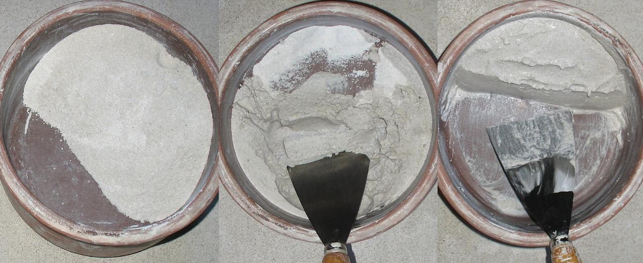 Both of the above techniques can be used to recycle mixtures in order to practice the fresco technique or to practice spreading mortar -as was frequently the case in our research. However, we would not recommend these methods for painting a fresco. The technique cannot be applied to a surface that is larger than a sample without the appearance of cracks and flaking when it dries.