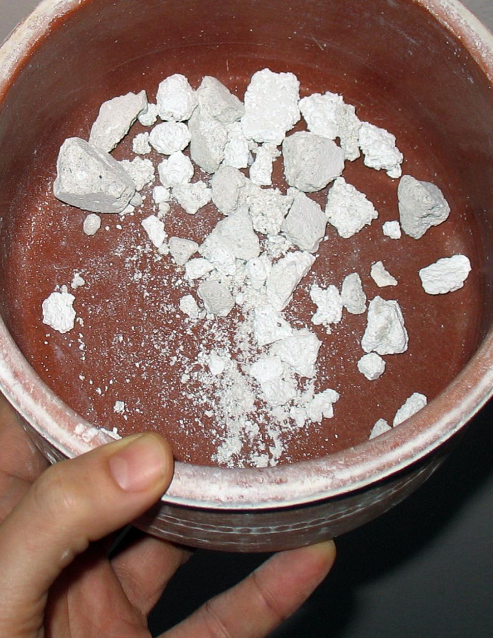 To prepare the dried lime for the samples we took a quantity of that lime and left it in an open container to dry for a month. It was then left in an open container to dry for a month (See Figure 1). When it was half dry it was crumbled to smaller pieces to accelerate its drying. The dry pieces were ground into powder and mixed with water to form a paste. When the paste settled the water was removed and the plaster was left to dry again. The final stage of preparation was to grind the dried lime into pieces of different sizes, from powder to medium sand. The preparation of the dried lime was based on the methods for lime white production described in artist manuals (Cennini, n.d., p.34; Taylor, 1843, p.43; Thomas, 1869, pp.38, 40; Laurie, 1910, p.123; Thompson, 1956, p.97; Seymour, 2003, pp.449, 451).