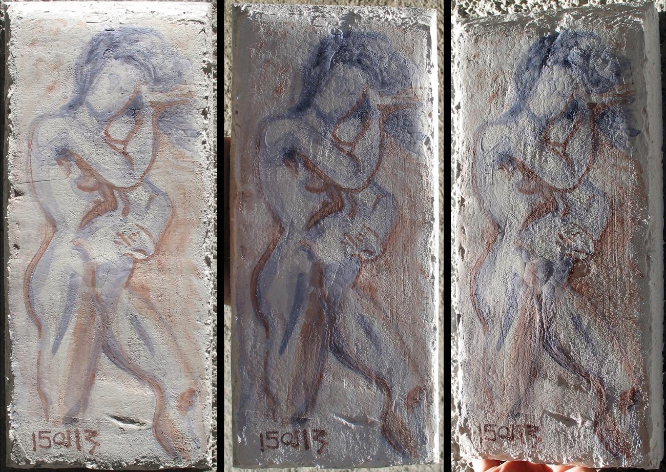 Sample 150113 Female Figure was our first attempt to make a mixture of lime plaster and dried powdered lime. The ratio of materials was 1 lime : 1 dried lime plaster crushed in thin and medium sand-sized pieces. The mixture was placed in one 6 mm thick layer, over a wetted base coat of lime and sand (See Figure 4). When it dried the layer was full of thin cracks, the majority of which were very shallow. The pigments were used in various states of dilution (including excessive dilution) and adhered well to the mixture (See Figure 5).
