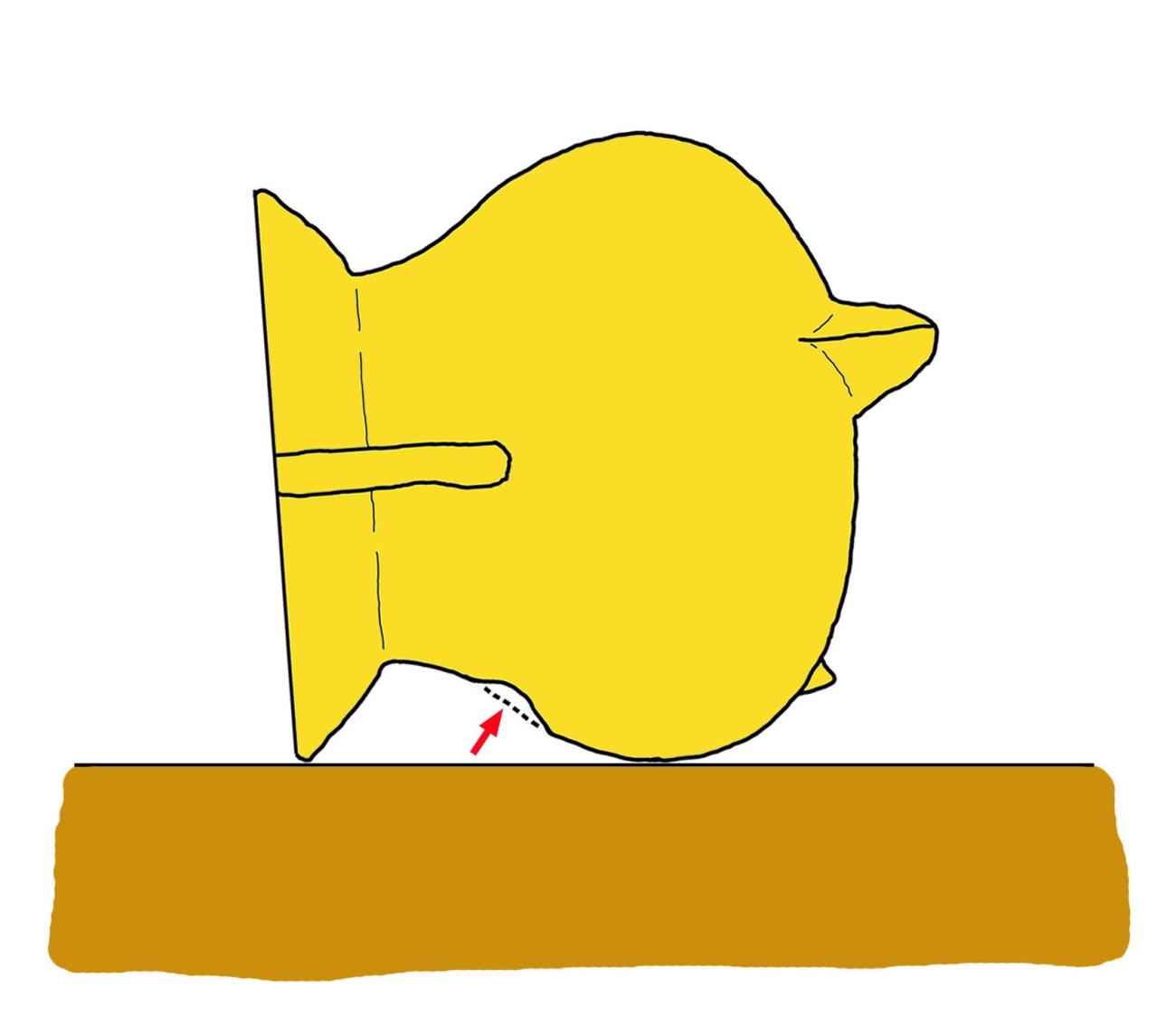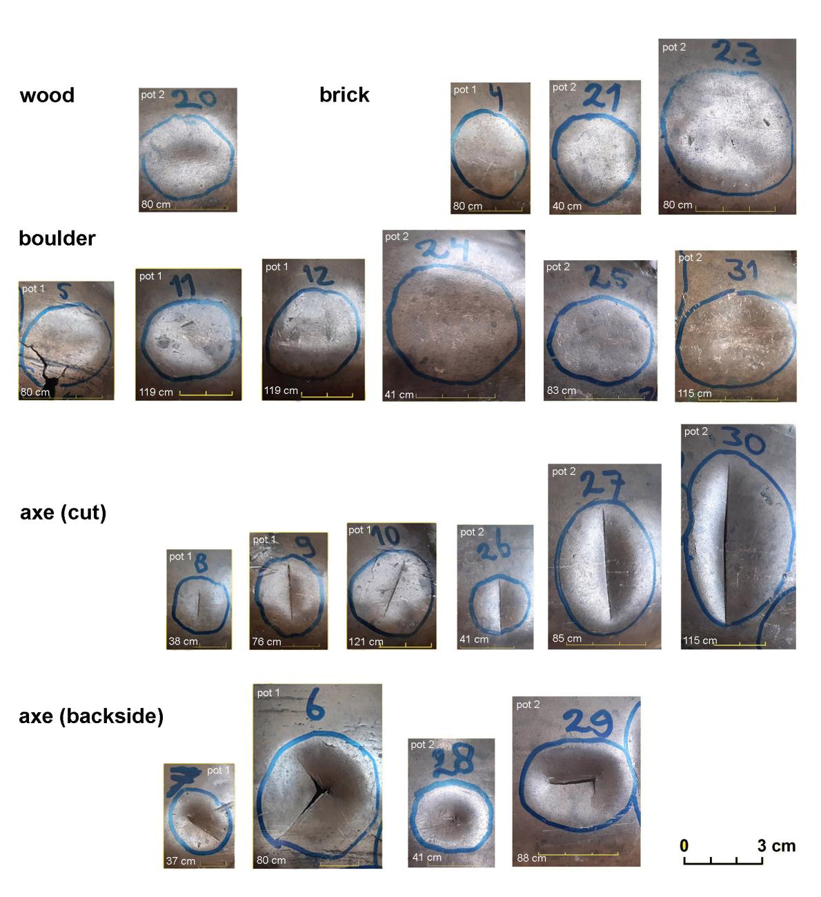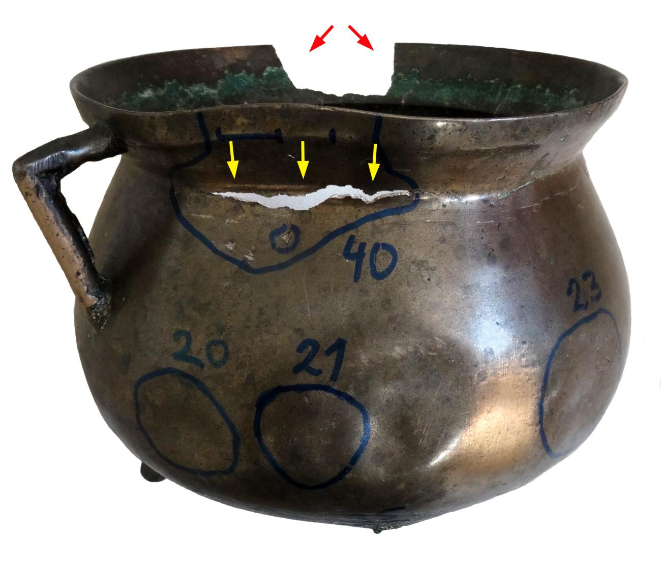 Of course, it is possible that a bronze cauldron may have slipped out of someone’s hands in the past. In such case, the height of the fall would have been about one and a half meters at most. However, the experiment demonstrated that much more energy is required for the dents and butts that we encounter on bronze cauldrons. The dents and butts must therefore have been deliberately inflicted. Why would you want to make a dent in a bronze cauldron?