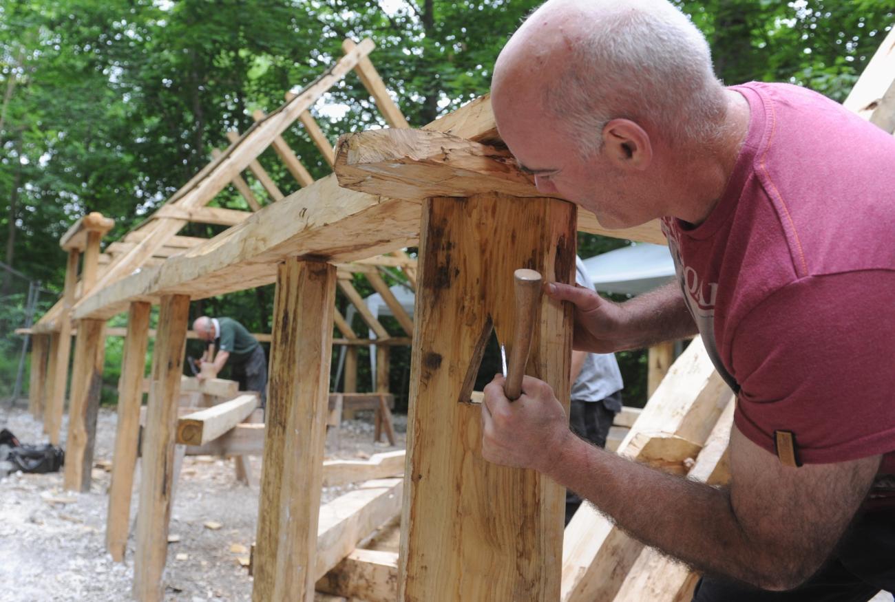 Tree wrighting of the Saxon era is quite different from the carpentry of our later historic buildings. During a two-and-a-half-week period beginning on 23 June 2015, under the supervision of Carpenter Joe Thompson, a team of three and five volunteers worked daily on the frame (See Figure 7). Sixteen individuals took part in this stage and all had attended at least one of the timber framing courses at the museum run by Joe, which had enabled them to demonstrate sufficient skills and express an interest in taking part in the upcoming project. A time lapse video of the construction process is online (Weald & Downland Living Museum, 2015). In 950AD, the tools used would be a hatchet, mallet, auger and string line, also the set of tools used in construction (See Figure 8). Rather than a tape measure, the team used a long piece of wood to check the building width and other lengths, as well as working by eye. Saws were not used in this type of construction at this time. The era has evidence of a range of fastenings, including treenails. Unlike the later buildings at the museum, joints were cut as the work progressed. The joints are known as a ‘tap lock’ joint in the main part of the frame, with scarfs and cup joints on the rafters. Several of the later buildings at the museum are also earth fast buildings, i.e., with timber posts that go straight into the ground, such as the Windlesham Carpenter’s shop and the posts of the Sheffield Park Saw pit. However, the horizontal timber sole plate was gradually adopted from the late 12th century and from this time timber framing, or ‘box frames’ as frames at the museum are classified, were widely known in this country.