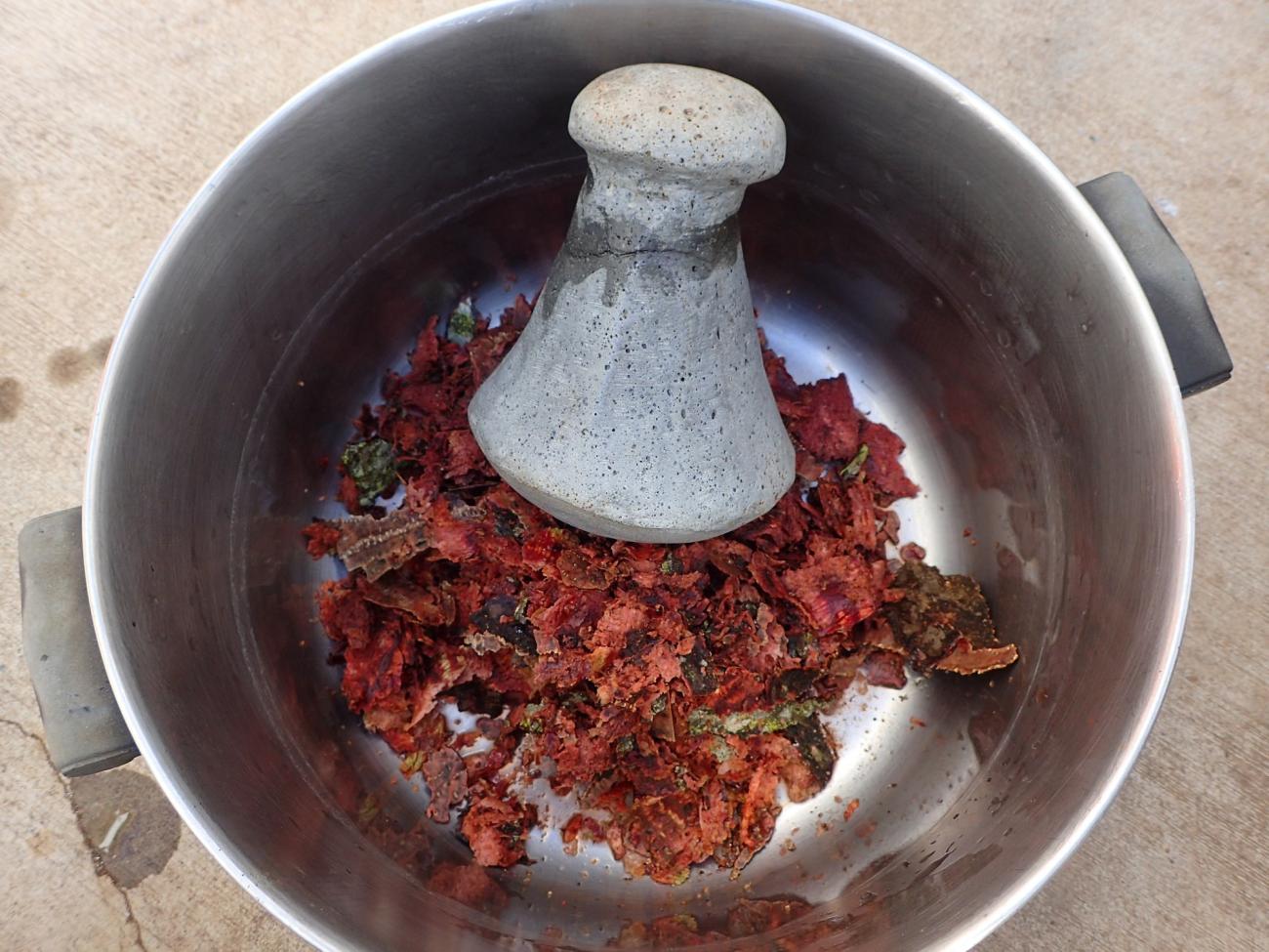 Hili kukui could be made using the inner bark of either the trunk or roots of the kukui tree (Krauss, 1993, p.66). The dye was prepared by pounding the bark and mixing it with water (Handy, et al., 1972, p.231). This activity would likely have been executed using a mortar and pestle, both made of stone (Krauss, 1993, p.67). I decided to use a pōhaku kuʻi ʻai (basalt stone pounder weighing 2 to 3 pounds, used for making poi, a staple starchy food), which I made several years ago, to pound the bark. For ease of retaining the dye liquid, I performed this activity in a stainless-steel pot (See Figure 1).