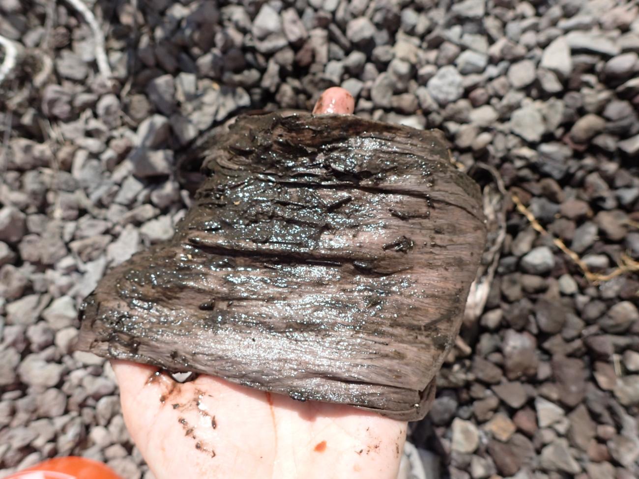 Due to restrictions owing to the COVID-19 pandemic, I was unable to visit any loʻi kalo on island. Fortunately, my friends with Hui Aloha Kīholo and The Nature Conservancy were happy to provide me with a bucket of rich, black lepo from the loko iʻa (fishpond) at Kīholo. I soaked the three sheets of moʻomoʻo in the lepo for just over two days. Upon removal, the moʻomoʻo were coated in mud and smelled almost sulfuric due to the anaerobic environment. After gently rinsing off the superficial layer of mud, their color proved to be grey, suggesting they had truly taken up color from their immersion (See Figure 5).
