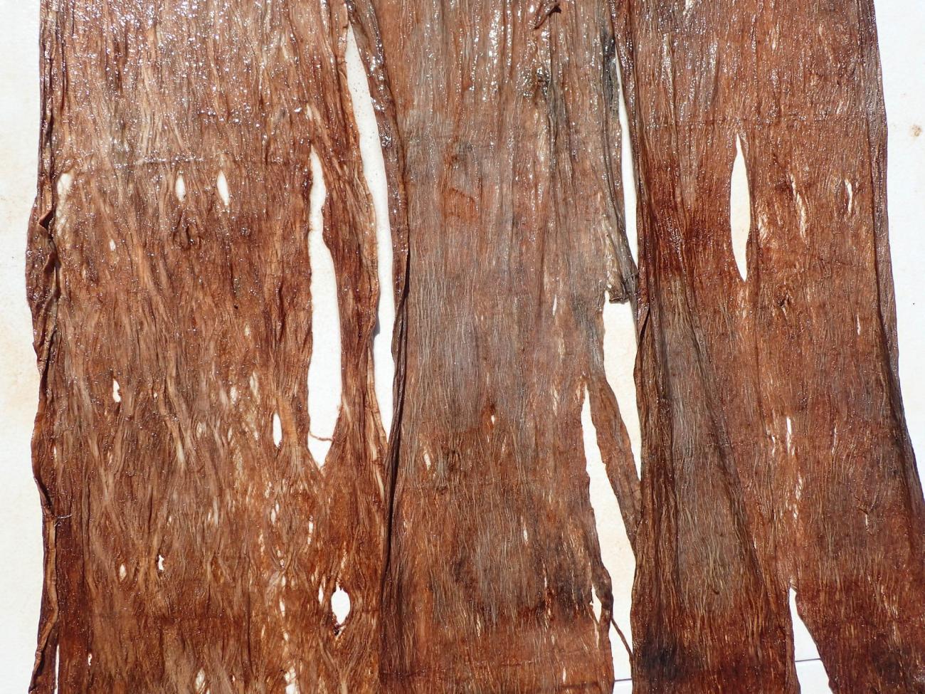 Although Kamakau never refers to the bast as being beaten prior to the dye processes, I chose to use beaten moʻomoʻo for this experiment. In my experience, beating the bast prior to dyeing allows the fibers to take up and retain more color. However, it would be interesting to attempt this experiment again with soaked, unbeaten bast, to determine whether there is a difference in the appearance of the finished product.