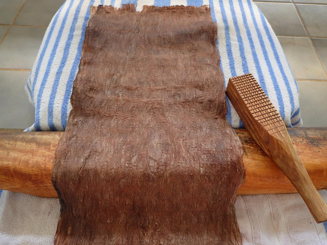 Kamakau cryptically says that the bast soaked “for a long time.” Uncertain as to just how long would be long enough, I decided to try eight days of submersion. Upon removal, I was pleasantly surprised at their appearance. Kamakau states that the bast turns dark after this procedure, and indeed, each moʻomoʻo had turned a dark coppery-brown (See Figure 7). After thoroughly rinsing and scraping them, they were ready to be beaten into a finished kapa.