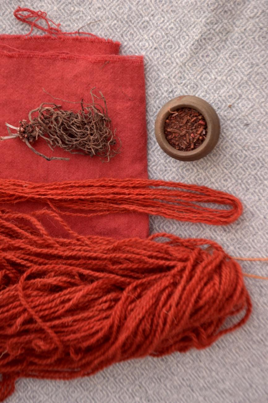 Madder is considered a strong dyestuff and, therefore, quite often used in relatively small amounts; however, to receive a maximum depth of colour in this experiment, a proportion of 1:1 of dyestuff and fibres were used. For 17 skeins with an overall weight of 85 g, the same weight of madder was used to prepare the dyeing bath. Madder was prepared according to Jenny Dean’s publication (2014 119). The dried ground roots and rhizomes were soaked overnight in water. The next day the liquid was simmered (60 – 80°C) for an hour and left to cool and strained.