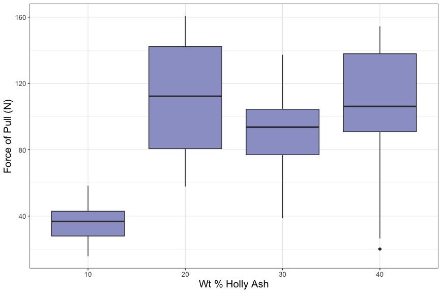 | Wt % Beech Ash | Force of Pull (N) | Wt % Beech Ash2 | Force of Pull (N)3 | Wt % Holly Ash | Force of Pull (N)4 |