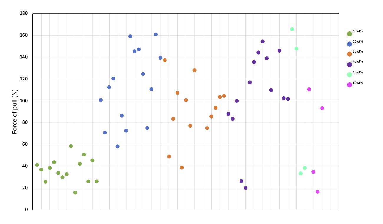 While there appears to be no strong statistical difference between the recipes over 20 wt% it is notable that there is a drop in mean strength and that, in the case of the 40 wt% group, this is accompanied by a greater standard deviation (See Figure 4). This leads us to hypothesise that a recipe mix in excess of approximately 20 wt%, while still capable of producing some strong seams, produces a less reliable glue overall. The limited data from the 50 wt% and 60 wt% samples also support this (See Figure 5), with the largest range of readings observed in the 50 wt% group and one of the lowest breaking forces recorded in the 60 wt% group. Whilst this hypothesis concerning variance and reliability may be refuted with larger samples, we expect that the increase in strength observed between the 10 wt% and 20 wt% will remain statistically meaningful.