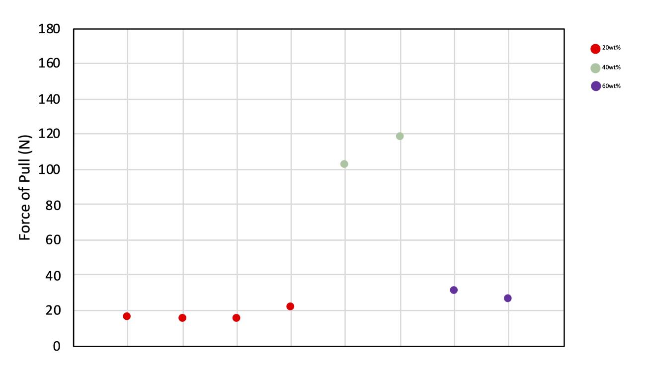 Table 4 below provides the breaking force data for each sample along with summaries of each recipe. Comparisons of the mean force (N), shows the 10 wt% group was the weakest, x = 36.41 N (sd. 11.02) and the 20 wt% was the strongest, x = 112.09 N (sd. 34.06). Interestingly, the average strength decreased with the 30 wt% group, x = 91 N (sd. 27.79), but then increased with the 40 wt% recipe to x = 104.79 N, (sd. 41.21).