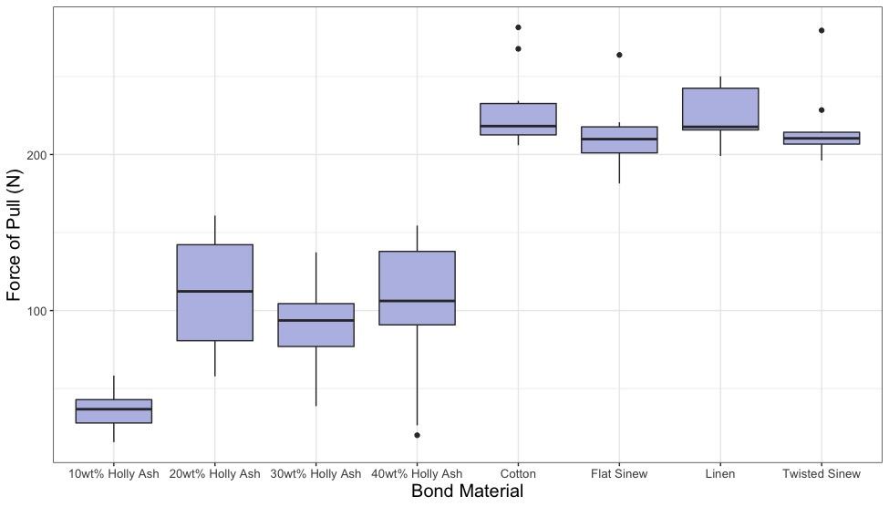Alongside strength, there is a difference in the variability of the strength of the bonds. Although some of the sewn groups have high outliers, these samples are far less variable than the birch tar samples tested here (See Figure 3). The variable strength of a birch tar bond is potentially its most significant limiting factor. Reliability of seam strength is an integral element of any effective garment and is likely to pose significant problems to people living highly active lifestyles if absent (Hosfield, 2016; Niven et al., 2012; White, 2006). It may be that factors in our manufacture process resulted in the increased variance and in doing so demonstrate a lack of expertise which might reasonably be expected to be present in a group with cultural knowledge of the process. One variable of interest was drying time. Our samples were dried at room temperature and in some cases took a week to dry. It is possible that drying the samples faster, for example by a fire, could produce different results.