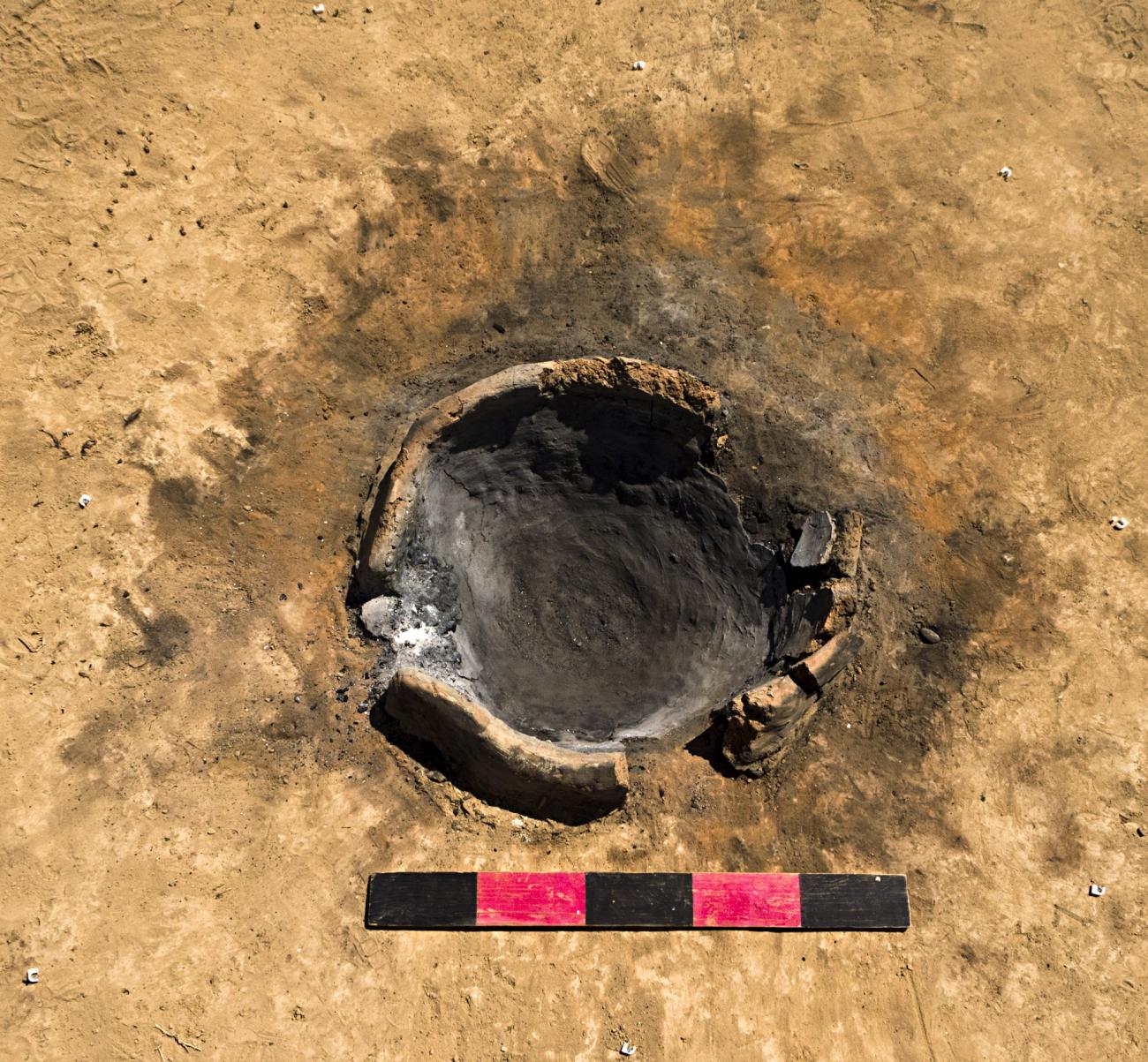 Two days after the experiment, the charcoal was removed and the furnace cleaned. Larger heat cracks occasionally occurred on the rim of the furnace wall. The regions close to the initial tuyère opening were vitrified on the inside, and sporadic spalling was visible on the outside (See Figure 9). Cross-sections of the furnace wall and the pit lining were grey or black due to unburned carbon from the chaff in regions initially covered with charcoal. On the outside, in direct contact with air, it had the typical intensive red colour of burnt clay. The chaff in the lining of the furnace pit bottom remained unburnt. Outside of the furnace, burnt and blackened soil clearly indicated the activity zones of the furnace, mainly to which area charcoal was moved when interacting with the crucible (See Figure 10).