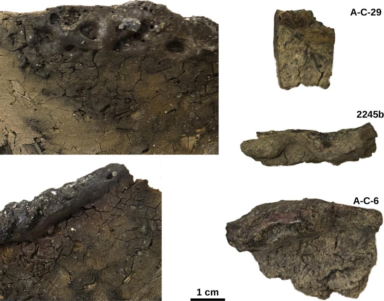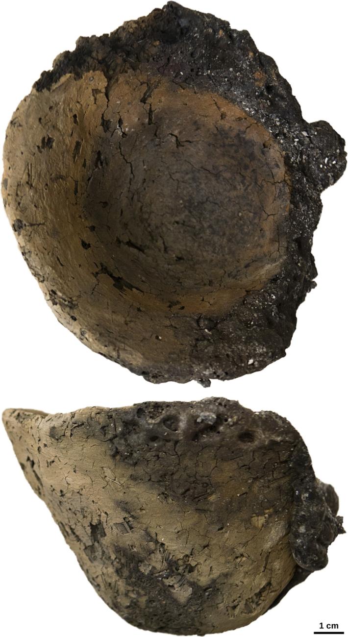 The extensive cracks and spalling of the Negev loess crucibles in the clay during cooling were probably caused by the rehydration of the calcium carbonates (cf. Shoval, et al., 1993). This feature is absent on the preserved archaeological crucible fragments, further indicating a highly localised hot zone on the top of the crucible in the ancient process and significantly lower temperatures on the outside of the crucible.